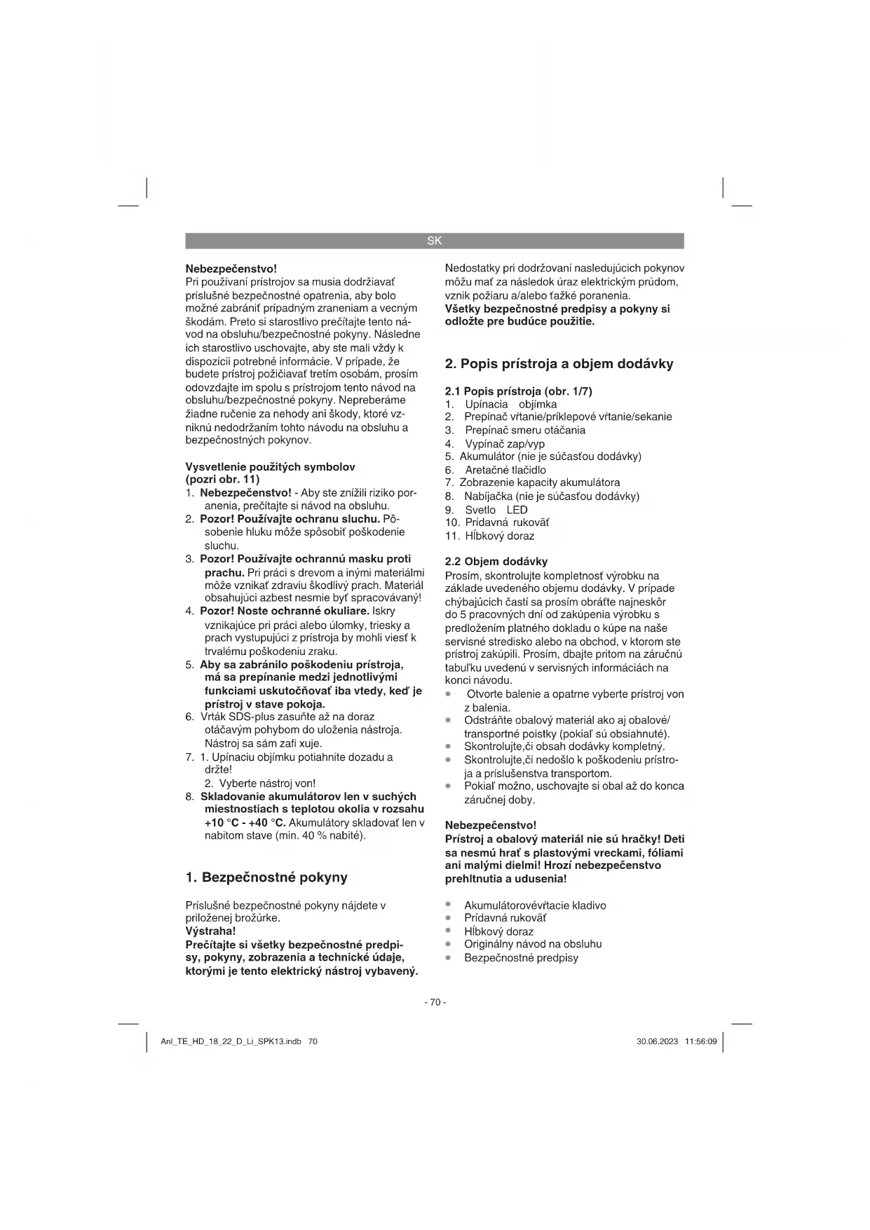 brácie rúk a ramien, pokiaľ sa prístroj bude používať dlhšiu dobu alebo sa nevedie a neudržuje správnym spôsobom. Anl_TE_HD_18_22_D_Li_SPK13.indb 71Anl_TE_HD_18_22_D_Li_SPK13.indb 71 30.06.2023 11:56:0930.06.2023 11:56:09SK