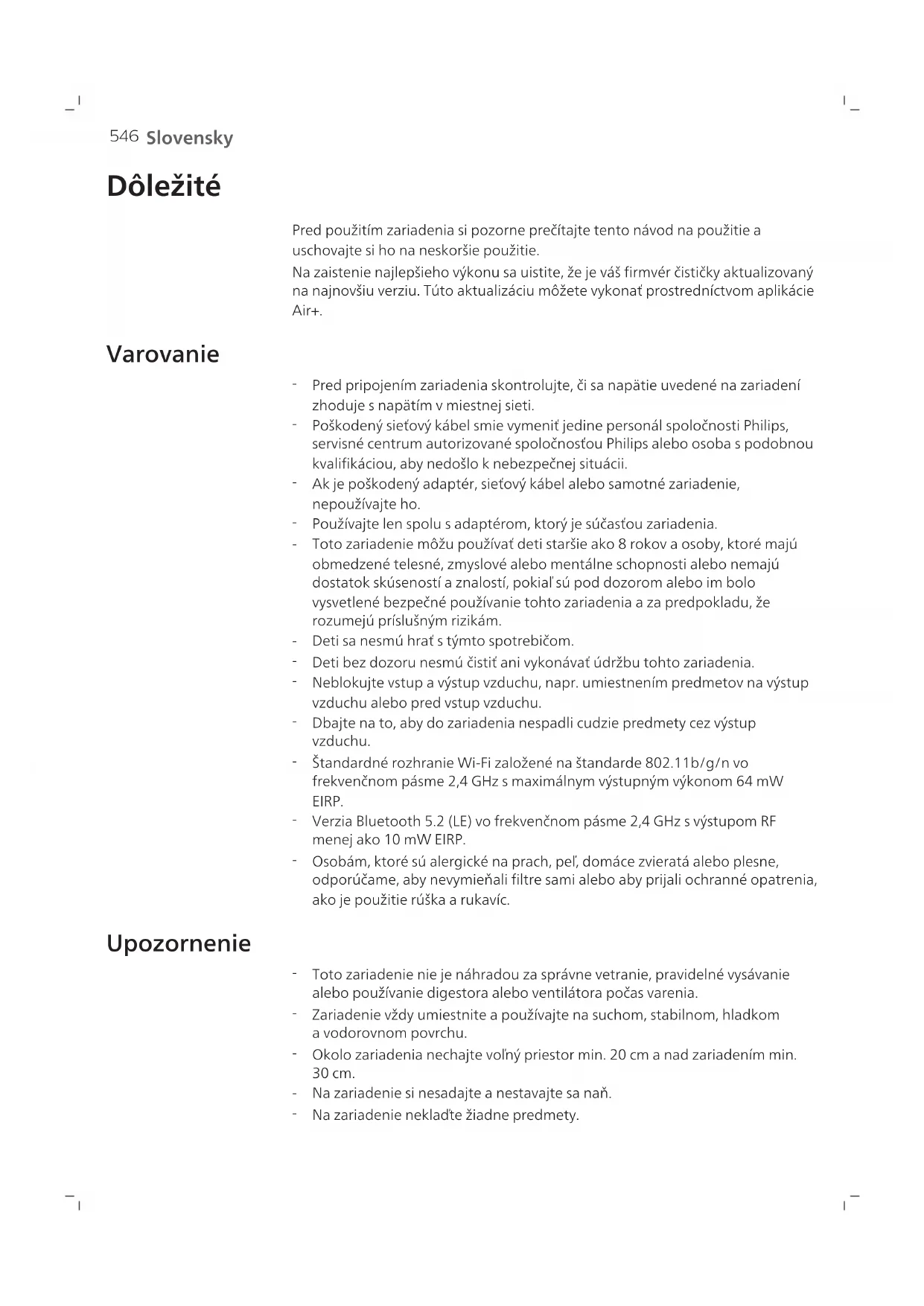 Slovensky Dôležité Pred použitím zariadenia si pozorne prečítajte tento návod na použitie a uschovajte si ho na neskoršie použitie. Na zaistenie najlepšieho výkonu sa uistite, že je váš firmvér čističky aktualizovaný na najnovšiu verziu. Túto aktualizáciu môžete vykonať prostredníctvom aplikácie Air+. Varovanie