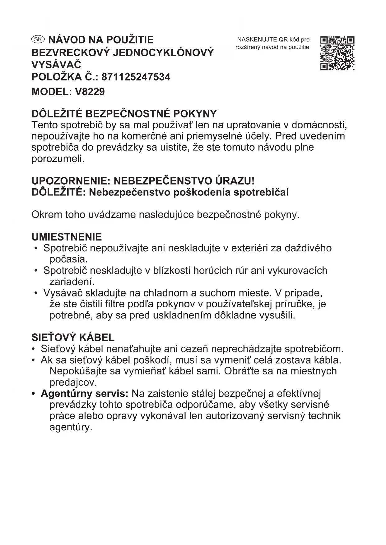 Tento spotrebič by sa mal používať len na upratovanie v domácnosti, nepoužívajte ho na komerčné ani priemyselné účely. Pred uvedením spotrebiča do prevádzky sa uistite, že ste tomuto návodu plne porozumeli. UPOZORNENIE: NEBEZPEČENSTVO ÚRAZU! DÔLEŽITÉ: Nebezpečenstvo poškodenia spotrebiča! Okrem toho uvádzame nasledujúce bezpečnostné pokyny. UMIESTNENIE