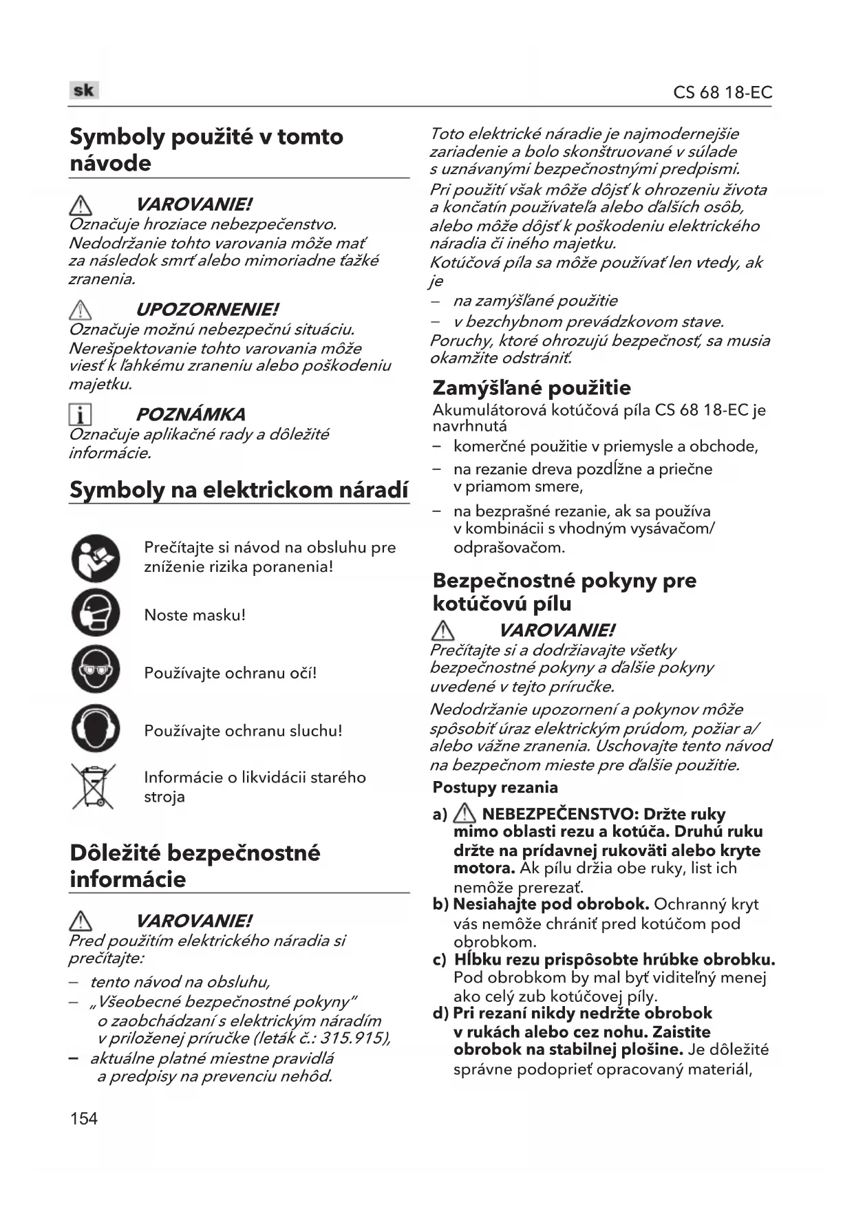 na zamýšľané použitie vbezchybnom prevádzkovom stave. Poruchy, ktoré ohrozujú bezpečnosť, sa musia okamžite odstrániť. Zamýšľané použitie Akumulátorová kotúčová píla CS 68 18-EC je navrhnutá