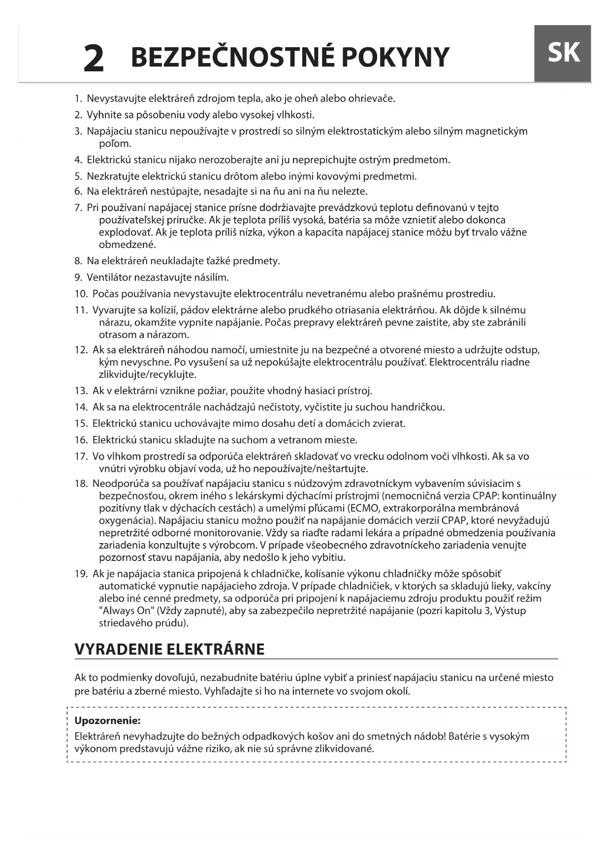 bezpečnosťou, okrem iného s lekárskymi dýchacími prístrojmi (nemocničná verzia CPAP: kontinuálny pozitívny tlak v dýchacích cestách) a umelými pľúcami (ECMO, extrakorporálna membránová oxygenácia). Napájaciu stanicu možno použiť na napájanie domácich verzií CPAP, ktoré nevyžadujú nepretržité odborné monitorovanie. Vždy sa riaďte radami lekára a prípadné obmedzenia používania zariadenia konzultujte s výrobcom. V prípade všeobecného zdravotníckeho zariadenia venujte pozornosť stavu napájania, aby nedošlo k jeho vybitiu.