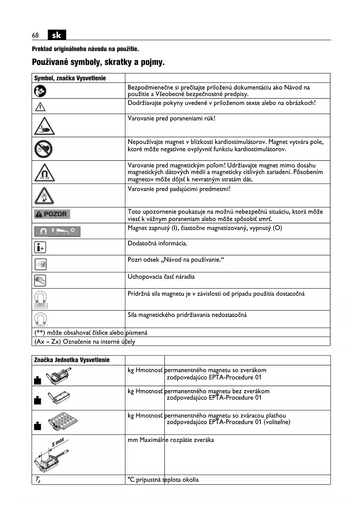 Preklad originálneho návodu na použitie. Používané symboly, skratky a pojmy. Symbol, značka Vysvetlenie Bezpodmienečne si prečítajte priloženú dokumentáciu ako Návod na použitie a Všeobecné bezpečnostné predpisy. Dodržiavajte pokyny uvedené v priloženom texte alebo na obrázkoch! Varovanie pred poraneniami rúk! Nepoužívajte magnet v blízkosti kardiostimulátorov. Magnet vytvára pole, ktoré môže negatívne ovplyvniť funkciu kardiostimulátorov. Varovanie pred magnetickým poľom! Udržiavajte magnet mimo dosahu magnetických dátových médií a magneticky citlivých zariadení. Pôsobením magnetov môže dôjsť k nevratným stratám dát. Varovanie pred padajúcimi predmetmi! Toto upozornenie poukazuje na možnú nebezpečnú situáciu, ktorá môže viesť k vážnym poraneniam alebo môže spôsobiť smrť. Magnet zapnutý (I), čiastočne magnetizovaný, vypnutý (O) Dodatočná informácia. Pozri odsek „Návod na používanie.“ Uchopovacia časť náradia Prídržná sila magnetu je v závislosti od prípadu použitia dostatočná Sila magnetického pridržiavania nedostatočná (**) môže obsahovať číslice alebo písmená (Ax – Zx) Označenie na interné účely Značka Jednotka Vysvetlenie kg Hmotnosť permanentného magnetu so zverákom zodpovedajúco EPTA-Procedure 01 kg Hmotnosť permanentného magnetu bez zverákom zodpovedajúco EPTA-Procedure 01 kg Hmotnosť permanentného magnetu so zváracou platňou zodpovedajúco EPTA-Procedure 01 (voliteľne) mm Maximálne rozpätie zveráka
