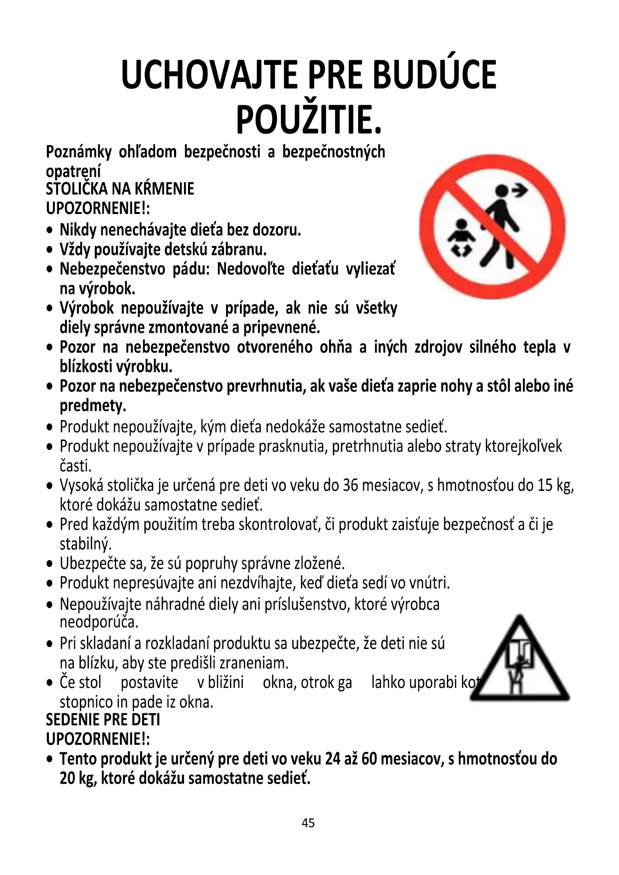 Pozor na nebezpečenstvo prevrhnutia, ak vaše dieťa zaprie nohy a stôl alebo iné predmety.