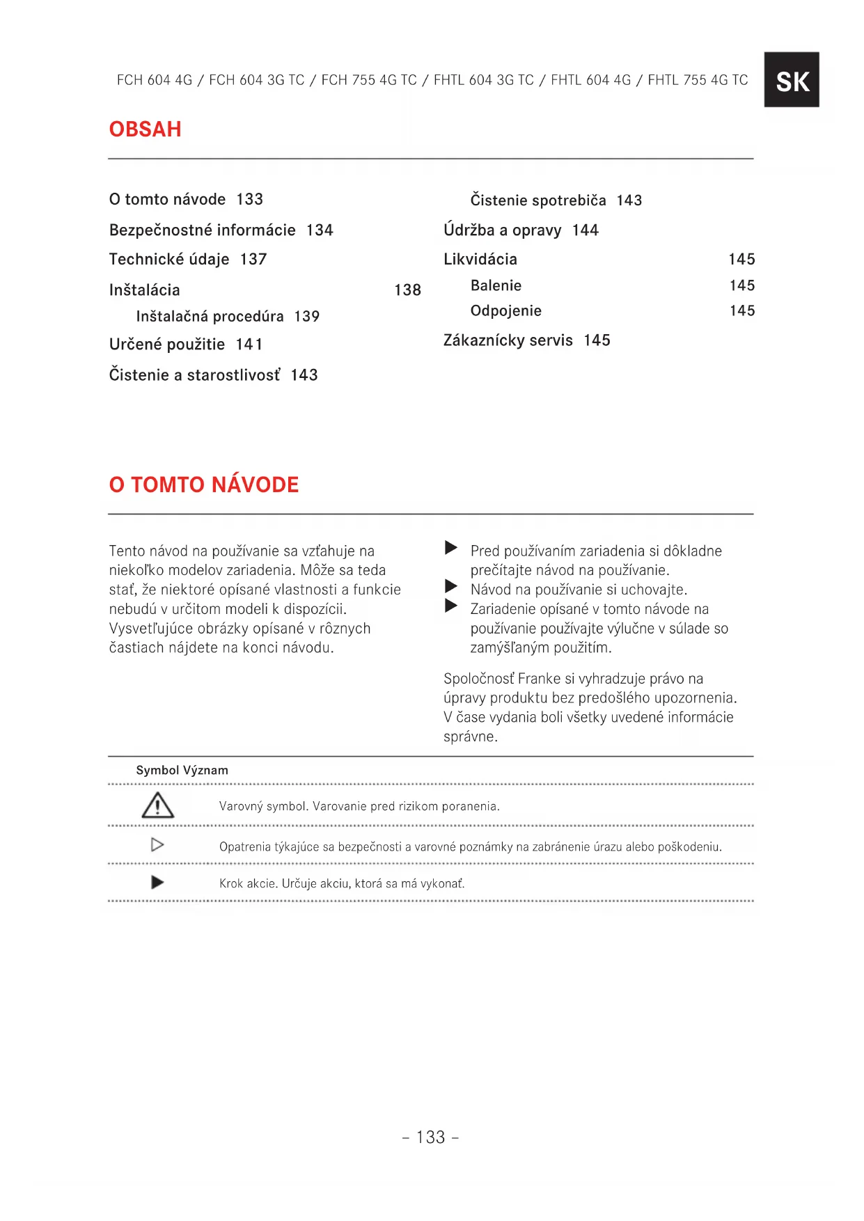 Zariadenie opísané v tomto návode na používanie používajte výlučne v súlade so zamýšľaným použitím. Spoločnosť Franke si vyhradzuje právo na úpravy produktu bez predošlého upozornenia. V čase vydania boli všetky uvedené informácie správne. OBSAH O tomto návode 133 Bezpečnostné informácie 134 Technické údaje 137 Inštalácia 138 Inštalačná procedúra 139 Určené použitie 141 Čistenie a starostlivosť 143 Čistenie spotrebiča 143 Údržba a opravy 144 Likvidácia 145 Balenie 145 Odpojenie 145 Zákaznícky servis 145– 134 – FCH 604 4G / FCH 604 3G TC / FCH 755 4G TC / FHTL 604 3G TC / FHTL 604 4G / FHTL 755 4G TC