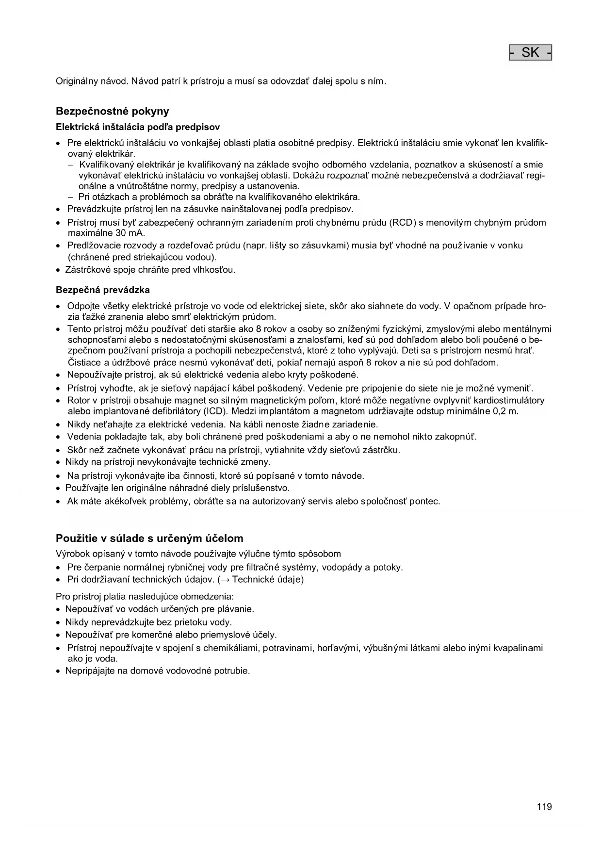 - SK - Originálny návod. Návod patrí k prístroju a musí sa odovzdať ďalej spolu s ním. Bezpečnostné pokyny Elektrická inštalácia podľa predpisov