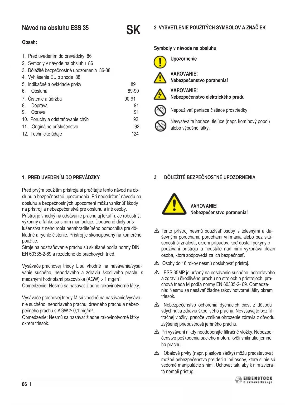Pred prvým použitím prístroja si prečítajte tento návod na ob- sluhu a bezpečnostné upozornenia. Pri nedodržaní návodu na obsluhu a bezpečnostných upozornení môžu vzniknúť škody na prístroji a nebezpečenstvá pre obsluhu a iné osoby. Prístroj je vhodný na odsávanie prachu aj tekutín. Je robustný, výkonný a ľahko sa s ním manipuluje. Dodávané diely prís- lušenstva z neho robia nenahraditeľného pomocníka pre dô- kladné a rýchle čistenie. Prístroj je skoncipovaný na komerčné použitie. Stroje na odstraňovanie prachu sú skúšané podľa normy DIN EN 60335-2-69 a rozdelené do prachových tried. Vysávače prachovej triedy L sú vhodné na nasávanie/vysá- vanie suchého, nehorľavého a zdraviu škodlivého prachu s medznými hodnotami pracoviska (AGW) > 1 mg/m³. Obmedzenie: Nesmú sa nasávať žiadne rakovinotvorné látky. Vysávače prachovej triedy M sú vhodné na nasávanie/vysáva- nie suchého, nehorľavého prachu, drevného prachu a nebez- pečného prachu s AGW ≥ 0,1 mg/m³. Obmedzenie: Nesmú sa nasávať žiadne rakovinotvorné látky okrem triesok. Návod na obsluhu ESS 35 Obsah: