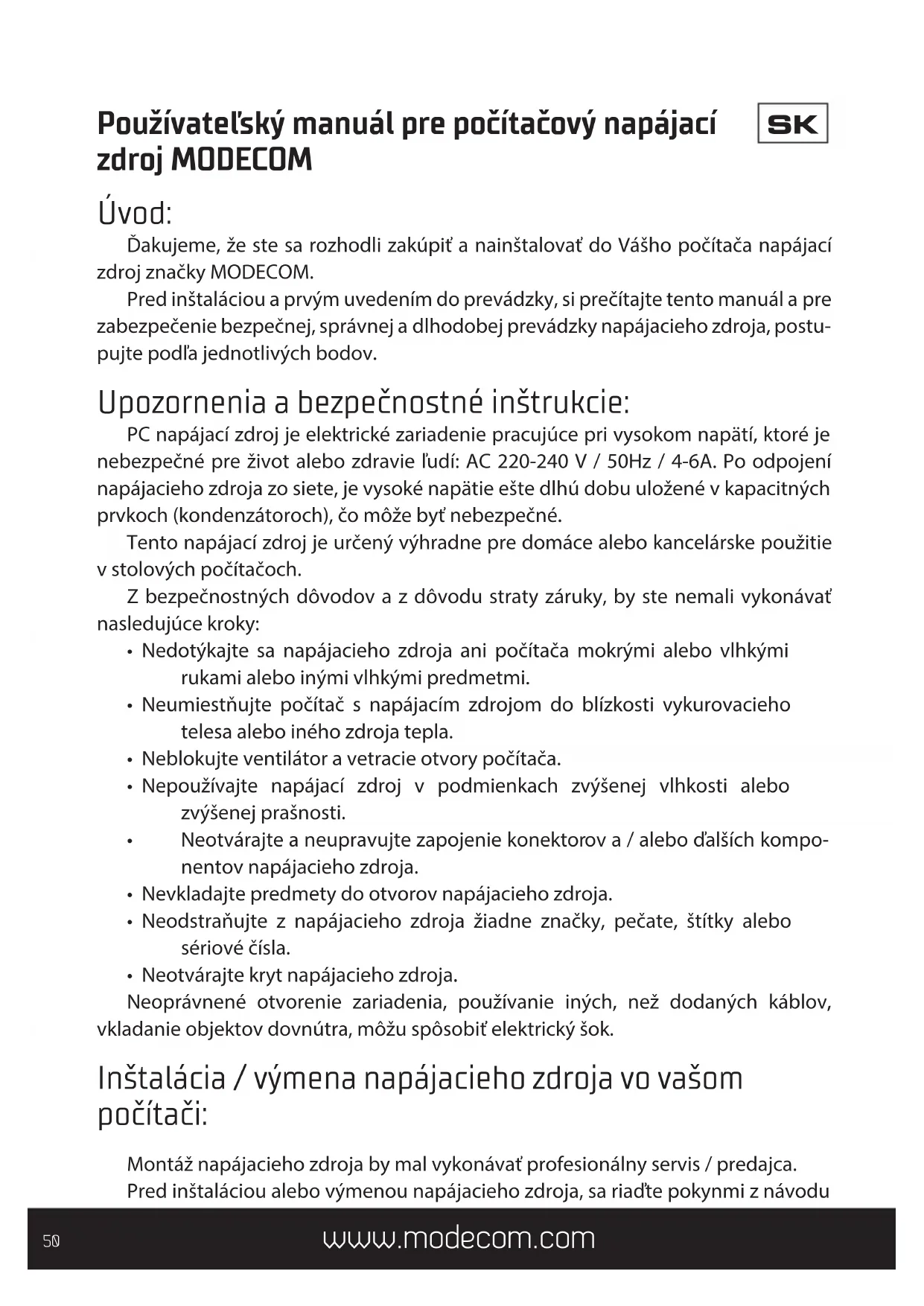 - Neotvárajte kryt napájacieho zdroja. Neoprávnené otvorenie zariadenia, používanie iných, než dodaných káblov, vkladanie objektov dovnútra, môžu spôsobiť elektrický šok. Inštalácia / výmena napájacieho zdroja vo vašom počítači: Montáž napájacieho zdroja by mal vykonávať profesionálny servis / predajca. Pred inštaláciou alebo výmenou napájacieho zdroja, sa riaďte pokynmi znávodu SKwww.modecom.com