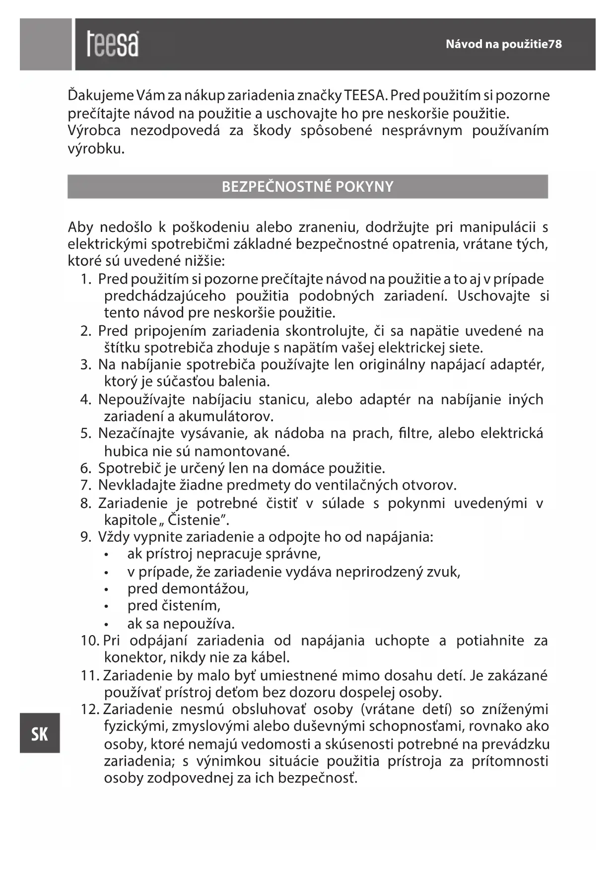 Ďakujeme Vám za nákup zariadenia značky TEESA. Pred použitím si pozorne prečítajte návod na použitie a uschovajte ho pre neskoršie použitie. Výrobca nezodpovedá za škody spôsobené nesprávnym používaním výrobku. Aby nedošlo k poškodeniu alebo zraneniu, dodržujte pri manipulácii s elektrickými spotrebičmi základné bezpečnostné opatrenia, vrátane tých, ktoré sú uvedené nižšie: