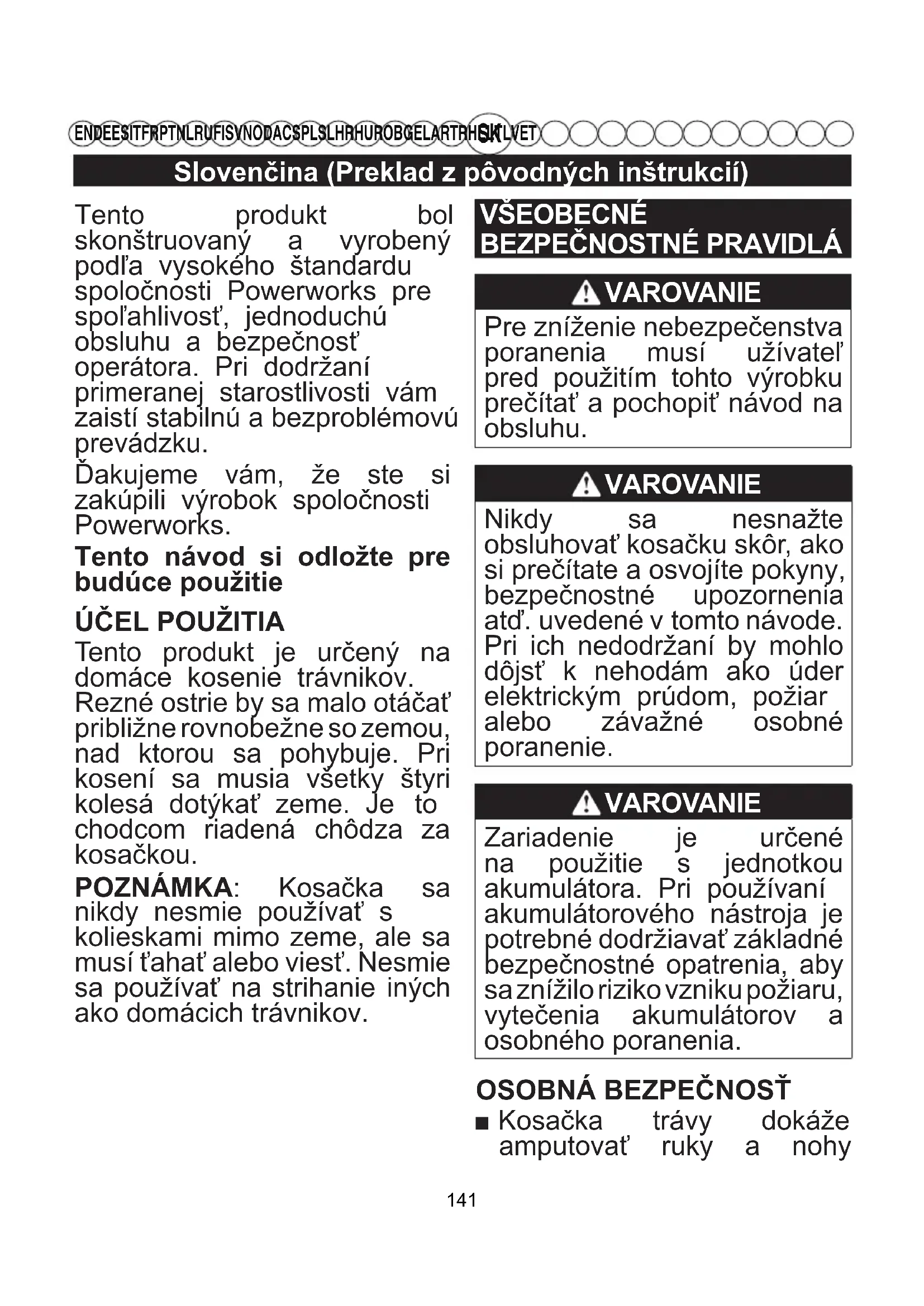 EN DE ES IT FR PT NL RU FI SV NO DA CS PL SL HR HU RO BG EL AR TR HE LT LV ET Tento produkt bol skonštruovaný a vyrobený podľa vysokého štandardu spoločnosti Powerworks pre spoľahlivosť, jednoduchú obsluhu a bezpečnosť operátora. Pri dodržaní primeranej starostlivosti vám zaistí stabilnú a bezproblémovú prevádzku. Ďakujeme vám, že ste si zakúpili výrobok spoločnosti Powerworks. Tento návod si odložte pre budúce použitie