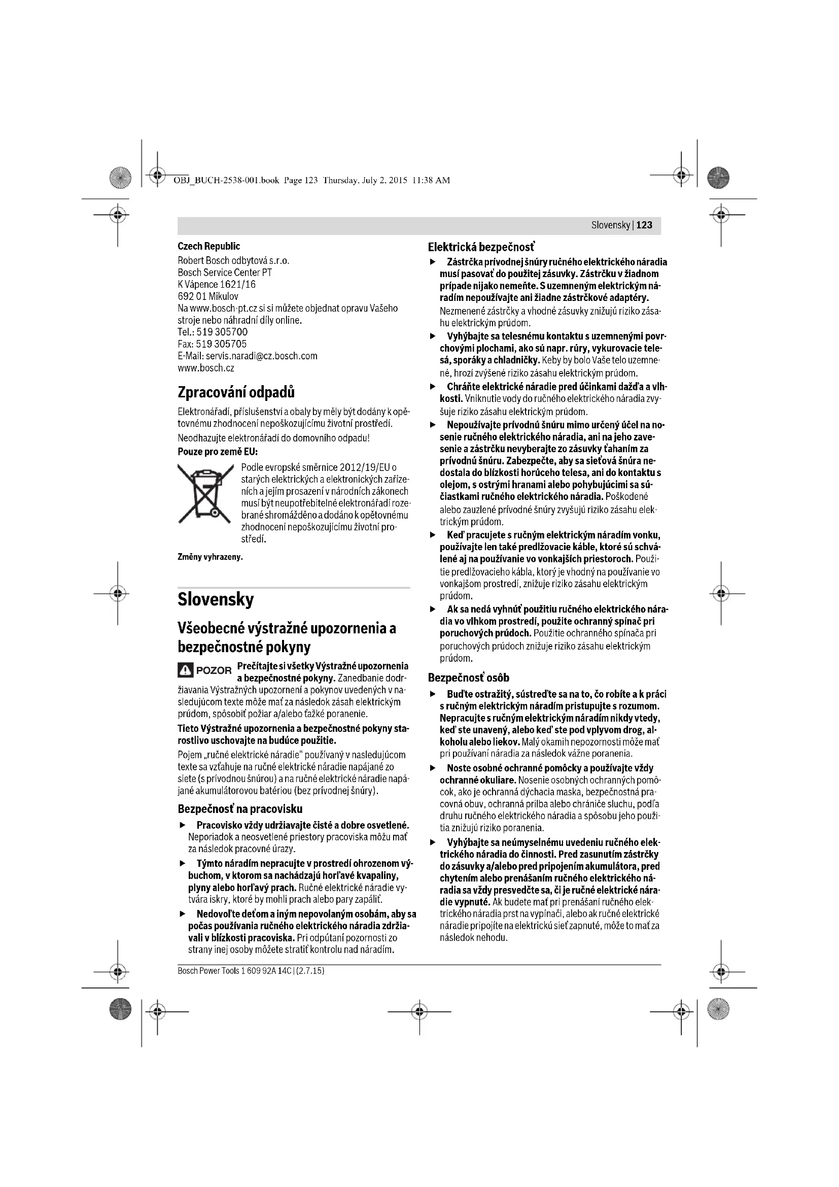 Volba příslušenství – 283 – 285 Cíl počínání Obrázek Mějte na zřeteli Strana OBJ_BUCH-2538-001.book Page 122 Thursday, July 2, 2015 11:38 AMSlovensky | 123 Bosch Power Tools 1 609 92A 14C | (2.7.15) Czech Republic Robert Bosch odbytová s.r.o. Bosch Service Center PT K Vápence 1621/16 692 01 Mikulov Na www.bosch-pt.cz si si můžete objednat opravu Vašeho stroje nebo náhradní díly online. Tel.: 519 305700 Fax: 519 305705 E-Mail: servis.naradi@cz.bosch.com www.bosch.cz Zpracování odpadů Elektronářadí, příslušenství a obaly by měly být dodány k opě- tovnému zhodnocení nepoškozujícímu životní prostředí. Neodhazujte elektronářadí do domovního odpadu! Pouze pro země EU: Podle evropské směrnice 2012/19/EU o starých elektrických a elektronických zaříze- ních a jejím prosazení v národních zákonech musí být neupotřebitelné elektronářadí roze- brané shromážděno a dodáno k opětovnému zhodnocení nepoškozujícímu životní pro- středí. Změny vyhrazeny. Slovensky Všeobecné výstražné upozornenia a bezpečnostné pokyny Prečítajte si všetky Výstražné upozornenia a bezpečnostné pokyny. Zanedbanie dodr- žiavania Výstražných upozornení a pokynov uvedených v na- sledujúcom texte môže mať za následok zásah elektrickým prúdom, spôsobiť požiar a/alebo ťažké poranenie. Tieto Výstražné upozornenia a bezpečnostné pokyny sta- rostlivo uschovajte na budúce použitie. Pojem „ručné elektrické náradie“ používaný v nasledujúcom texte sa vzťahuje na ručné elektrické náradie napájané zo siete (s prívodnou šnúrou) a na ručné elektrické náradie napá- jané akumulátorovou batériou (bez prívodnej šnúry). Bezpečnosť na pracovisku Pracovisko vždy udržiavajte čisté a dobre osvetlené. Neporiadok a neosvetlené priestory pracoviska môžu mať za následok pracovné úrazy. Týmto náradím nepracujte v prostredí ohrozenom vý- buchom, v ktorom sa nachádzajú horľavé kvapaliny, plyny alebo horľavý prach. Ručné elektrické náradie vy- tvára iskry, ktoré by mohli prach alebo pary zapáliť. Nedovoľte deťom a iným nepovolaným osobám, aby sa počas používania ručného elektrického náradia zdržia- vali v blízkosti pracoviska. Pri odpútaní pozornosti zo strany inej osoby môžete stratiť kontrolu nad náradím. Elektrická bezpečnosť Zástrčka prívodnej šnúry ručného elektrického náradia musí pasovať do použitej zásuvky. Zástrčku v žiadnom prípade nijako nemeňte. S uzemneným elektrickým ná- radím nepoužívajte ani žiadne zástrčkové adaptéry. Nezmenené zástrčky a vhodné zásuvky znižujú riziko zása- hu elektrickým prúdom. Vyhýbajte sa telesnému kontaktu s uzemnenými povr- chovými plochami, ako sú napr. rúry, vykurovacie tele- sá, sporáky a chladničky. Keby by bolo Vaše telo uzemne- né, hrozí zvýšené riziko zásahu elektrickým prúdom. Chráňte elektrické náradie pred účinkami dažďa a vlh- kosti. Vniknutie vody do ručného elektrického náradia zvy- šuje riziko zásahu elektrickým prúdom. Nepoužívajte prívodnú šnúru mimo určený účel na no- senie ručného elektrického náradia, ani na jeho zave- senie a zástrčku nevyberajte zo zásuvky ťahaním za prívodnú šnúru. Zabezpečte, aby sa sieťová šnúra ne- dostala do blízkosti horúceho telesa, ani do kontaktu s olejom, s ostrými hranami alebo pohybujúcimi sa sú- čiastkami ručného elektrického náradia. Poškodené alebo zauzlené prívodné šnúry zvyšujú riziko zásahu elek- trickým prúdom. Keď pracujete s ručným elektrickým náradím vonku, používajte len také predlžovacie káble, ktoré sú schvá- lené aj na používanie vo vonkajších priestoroch. Použi- tie predlžovacieho kábla, ktorý je vhodný na používanie vo vonkajšom prostredí, znižuje riziko zásahu elektrickým prúdom. Ak sa nedá vyhnúť použitiu ručného elektrického nára- dia vo vlhkom prostredí, použite ochranný spínač pri poruchových prúdoch. Použitie ochranného spínača pri poruchových prúdoch znižuje riziko zásahu elektrickým prúdom. Bezpečnosť osôb Buďte ostražitý, sústreďte sa na to, čo robíte a k práci s ručným elektrickým náradím pristupujte s rozumom. Nepracujte s ručným elektrickým náradím nikdy vtedy, keď ste unavený, alebo keď ste pod vplyvom drog, al- koholu alebo liekov. Malý okamih nepozornosti môže mať pri používaní náradia za následok vážne poranenia. Noste osobné ochranné pomôcky a používajte vždy ochranné okuliare. Nosenie osobných ochranných pomô- cok, ako je ochranná dýchacia maska, bezpečnostná pra- covná obuv, ochranná prilba alebo chrániče sluchu, podľa druhu ručného elektrického náradia a spôsobu jeho použi- tia znižujú riziko poranenia. Vyhýbajte sa neúmyselnému uvedeniu ručného elek- trického náradia do činnosti. Pred zasunutím zástrčky do zásuvky a/alebo pred pripojením akumulátora, pred chytením alebo prenášaním ručného elektrického ná- radia sa vždy presvedčte sa, či je ručné elektrické nára- die vypnuté. Ak budete mať pri prenášaní ručného elek- trického náradia prst na vypínači, alebo ak ručné elektrické náradie pripojíte na elektrickú sieť zapnuté, môže to mať za následok nehodu. POZOR OBJ_BUCH-2538-001.book Page 123 Thursday, July 2, 2015 11:38 AM124 | Slovensky 1 609 92A 14C | (2.7.15) Bosch Power Tools Skôr ako náradie zapnete, odstráňte z neho nastavova- cie náradie alebo kľúče na skrutky. Nastavovací nástroj alebo kľúč, ktorý sa nachádza v rotujúcej časti ručného elektrického náradia, môže spôsobiť vážne poranenia osôb. Vyhýbajte sa abnormálnym polohám tela. Zabezpečte si pevný postoj, a neprestajne udržiavajte rovnováhu. Takto budete môcť ručné elektrické náradie v neočakáva- ných situáciách lepšie kontrolova