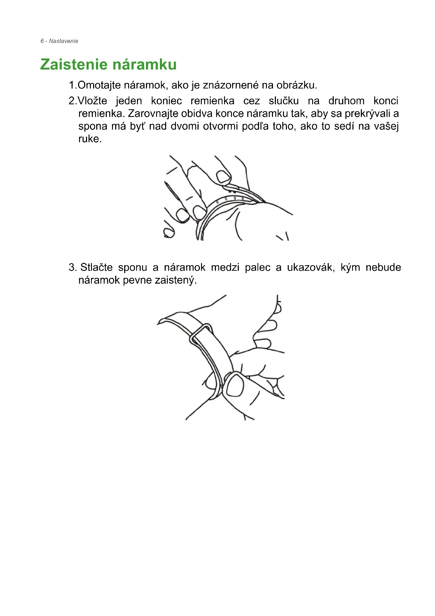 - USB kábel Nabíjanie batérie Pri prvom použití je potrebné zariadenie Leap úplne nabiť. zariadenie Leap sa nabije doplna približne za 90 minút. Po prvom nabití môžete nabíjať podľa potreby. 1.Vložte zariadenie Leap do kolísky, zarovnajte správne nabíjacie konektory. Zaistite, aby zariadenie Leap do kolísky zacvaklo.Nastavenie - 5 2.Pomocou priloženého kábla USB pripojte kolísku k počítaču. 3.Nabíjajte zariadenie Leap asi 90 minút, kým nebude nabitý doplna. Priebeh nabíjania môžete sledovať na obrazovke. Poznámka Dvojitým klepnutím na obrazovku zobrazíte úroveň nabitia.6 - Nastavenie Zaistenie náramku 1.Omotajte náramok, ako je znázornené na obrázku. 2.Vložte jeden koniec remienka cez slučku na druhom konci remienka. Zarovnajte obidva konce náramku tak, aby sa prekrývali a spona má byť nad dvomi otvormi podľa toho, ako to sedí na vašej ruke.