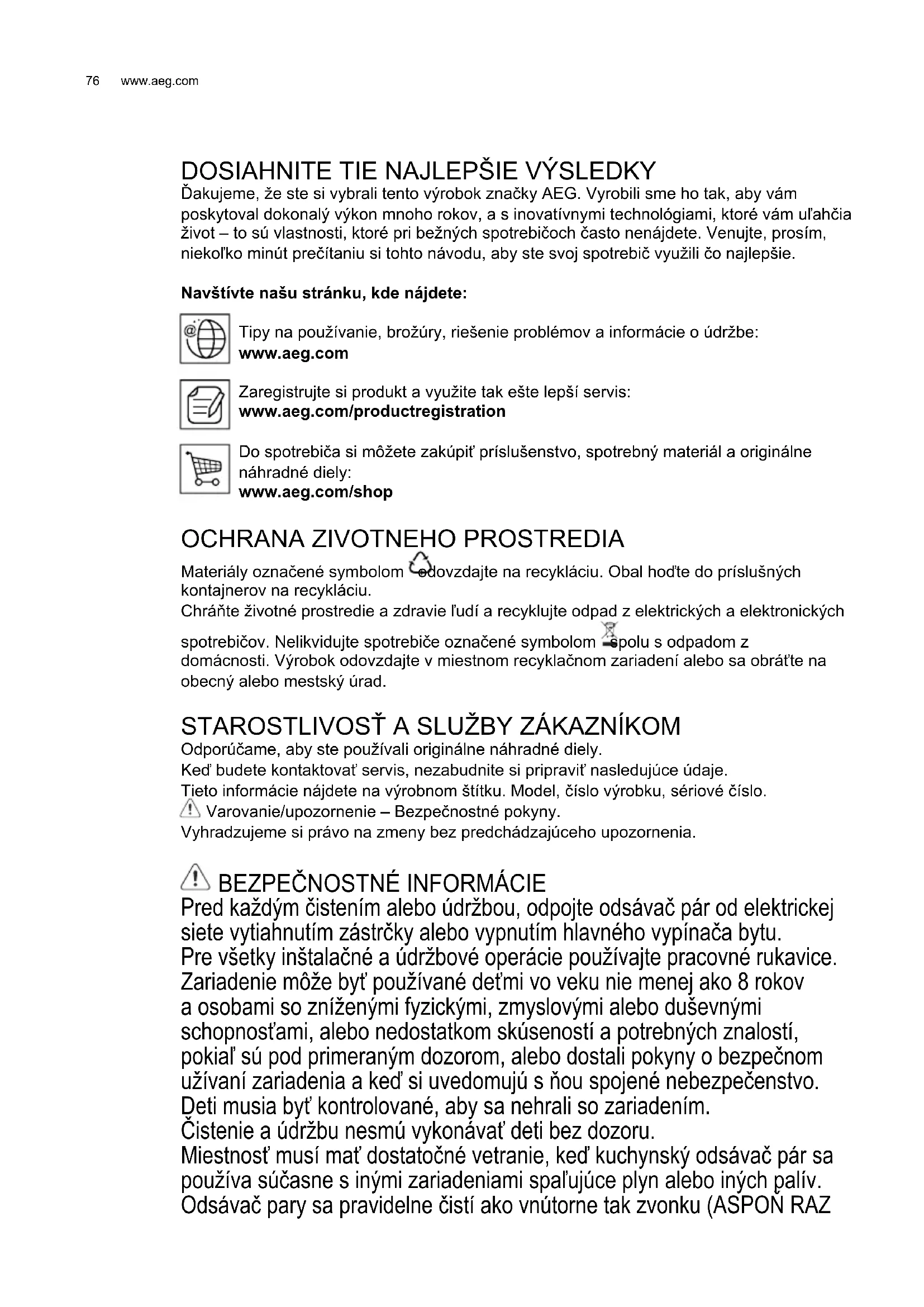 Ďakujeme, že ste si vybrali tento výrobok značky AEG. Vyrobili sme ho tak, aby vám poskytoval dokonalý výkon mnoho rokov, a s inovatívnymi technológiami, ktoré vám uľahčia život – to sú vlastnosti, ktoré pri bežných spotrebičoch často nenájdete. Venujte, prosím, niekoľko minút prečítaniu si tohto návodu, aby ste svoj spotrebič využili čo najlepšie. Navštívte našu stránku, kde nájdete: Tipy na používanie, brožúry, riešenie problémov a informácie o údržbe: www.aeg.com Zaregistrujte si produkt a využite tak ešte lepší servis: www.aeg.com/productregistration Do spotrebiča si môžete zakúpiť príslušenstvo, spotrebný materiál a originálne náhradné diely: www.aeg.com/shop