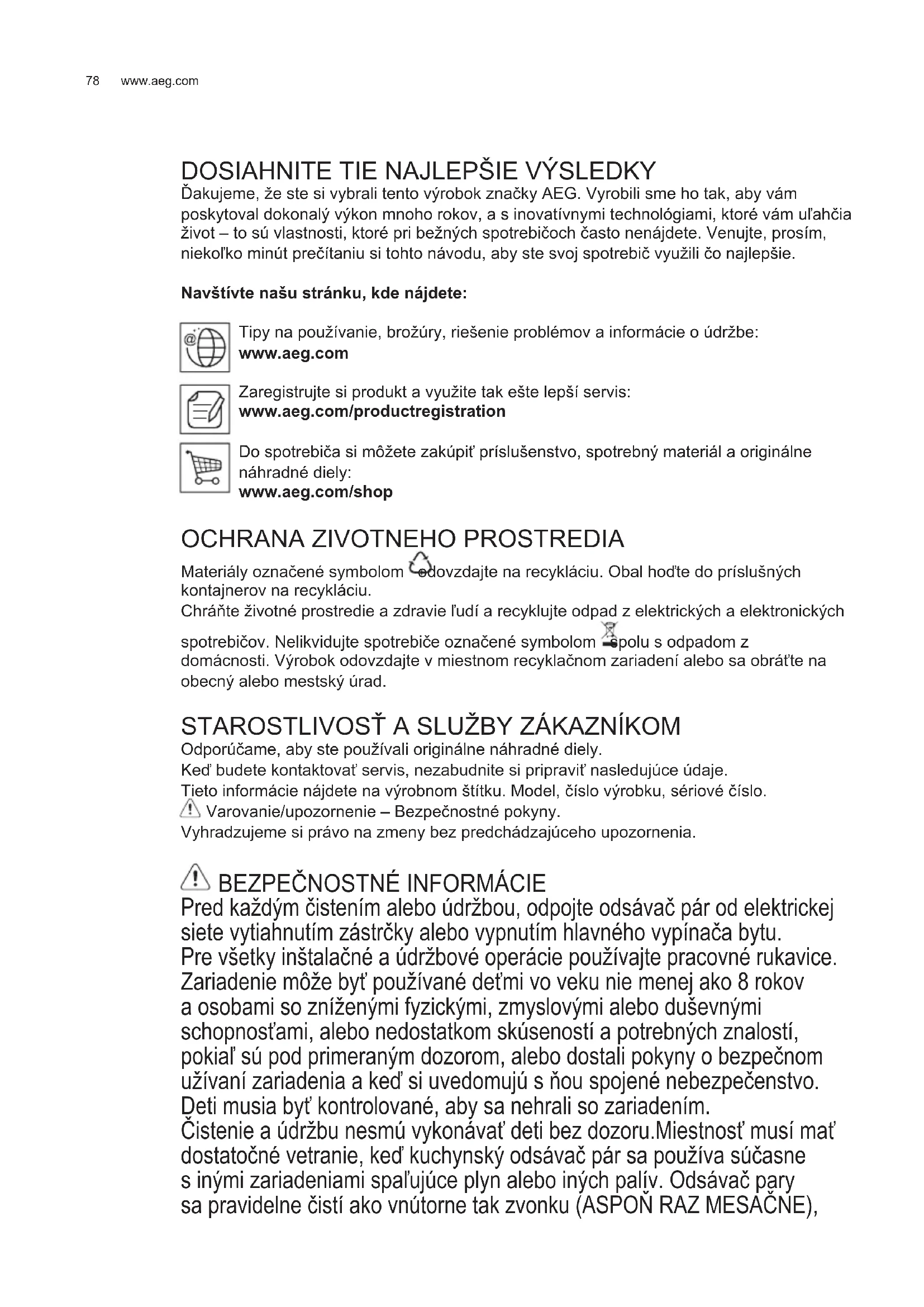 Ďakujeme, že ste si vybrali tento výrobok značky AEG. Vyrobili sme ho tak, aby vám poskytoval dokonalý výkon mnoho rokov, a s inovatívnymi technológiami, ktoré vám uľahčia život – to sú vlastnosti, ktoré pri bežných spotrebičoch často nenájdete. Venujte, prosím, niekoľko minút prečítaniu si tohto návodu, aby ste svoj spotrebič využili čo najlepšie. Navštívte našu stránku, kde nájdete: Tipy na používanie, brožúry, riešenie problémov a informácie o údržbe: www.aeg.com Zaregistrujte si produkt a využite tak ešte lepší servis: www.aeg.com/productregistration Do spotrebiča si môžete zakúpiť príslušenstvo, spotrebný materiál a originálne náhradné diely: www.aeg.com/shop