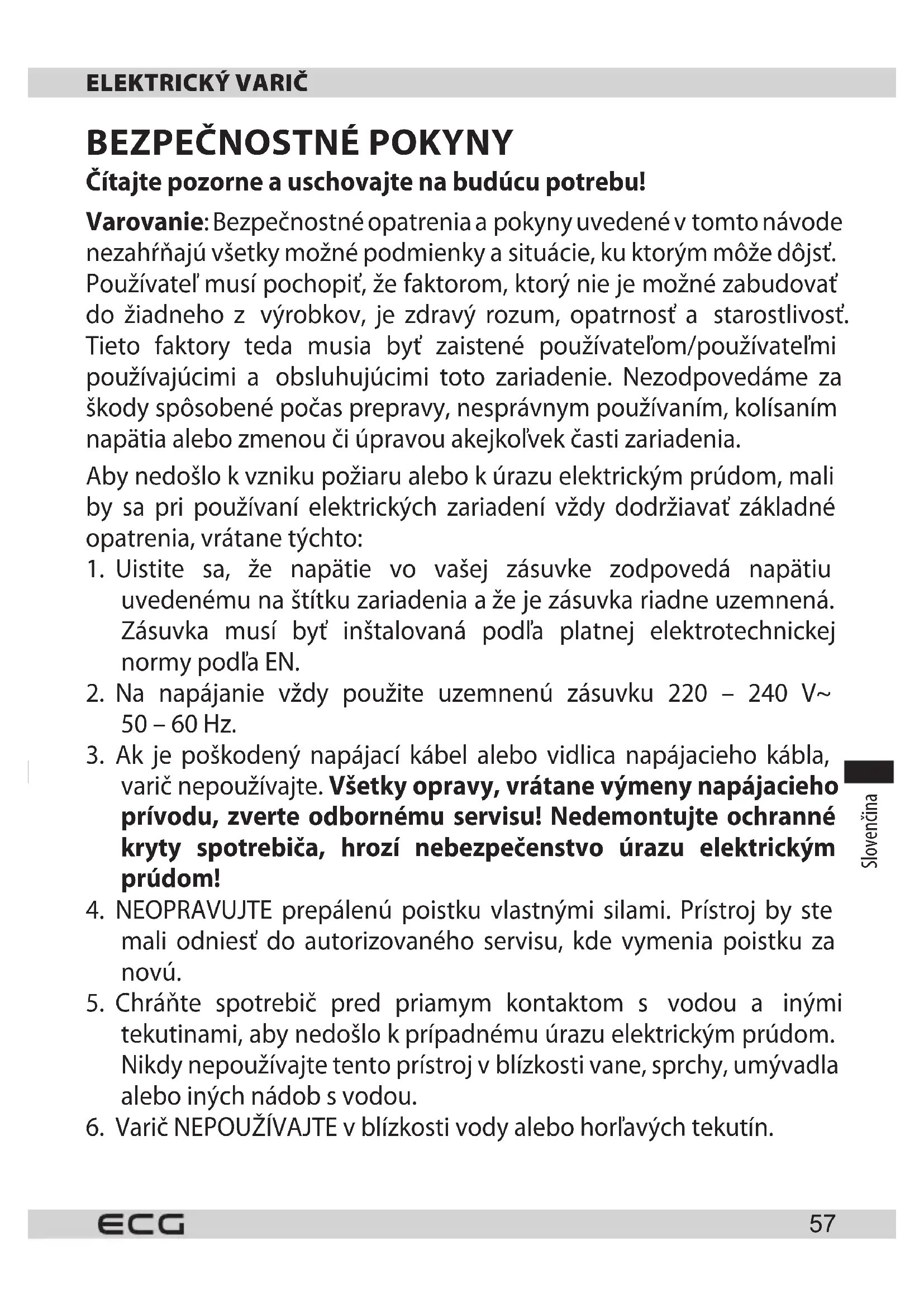 Baliaci papier avlnitá lepenka – odovzdajte do zberných surovín. Prebalová fólia, PE vrecká, plastové diely – vyhadzujte do kontajnerov na plasty. LIKVIDÁCIA VÝROBKU PO SKONČENÍ ŽIVOTNOSTI Likvidácia použitých elektrických aelektronických zariadení (platí v členských krajinách EÚ aďalších európskych krajinách so zavedeným systémom triedenia odpadu)Vyobrazený symbol na produkte alebo na obale znamená, že sproduktom by sa nemalo nakladať ako sdomovým odpadom. Produkt odovzdajte na miesto určené na recykláciu elektrických aelektronických zariadení. Správnou likvidáciou produktu zabránite negatívnym vplyvom na ľudské zdravie a životné prostredie. Recyklácia materiálov prispieva kochrane prírodných zdrojov. Viac informácií orecyklácii tohto produktu vám poskytne obecný úrad, organizácia na spracovanie domového odpadu alebo predajné miesto, kde ste produkt kúpili. Tento výrobok spĺňa požiadavky smerníc EÚ o elektromagnetickej kompatibilite a elektrickej bezpečnosti. Návod na obsluhu je k dispozícii na webových stránkach www.ecg.sk. Zmena textu a technických parametrov vyhradená. 08/05Slovenščina Slovenščina