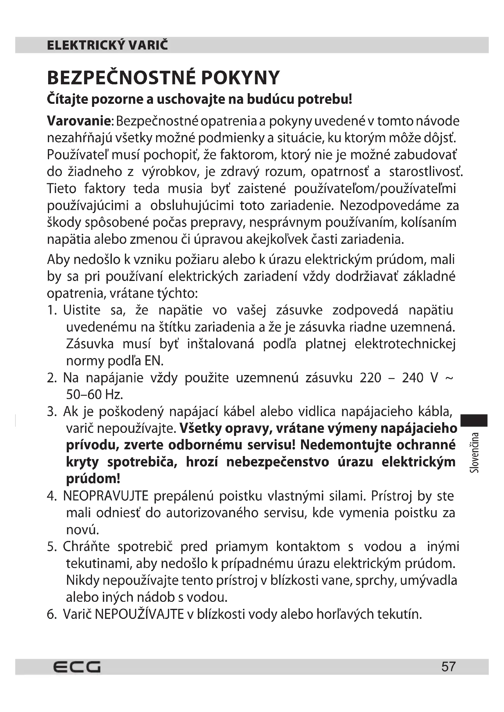 6. Varič NEPOUŽÍVAJTE vblízkosti vody alebo horľavých tekutín.
