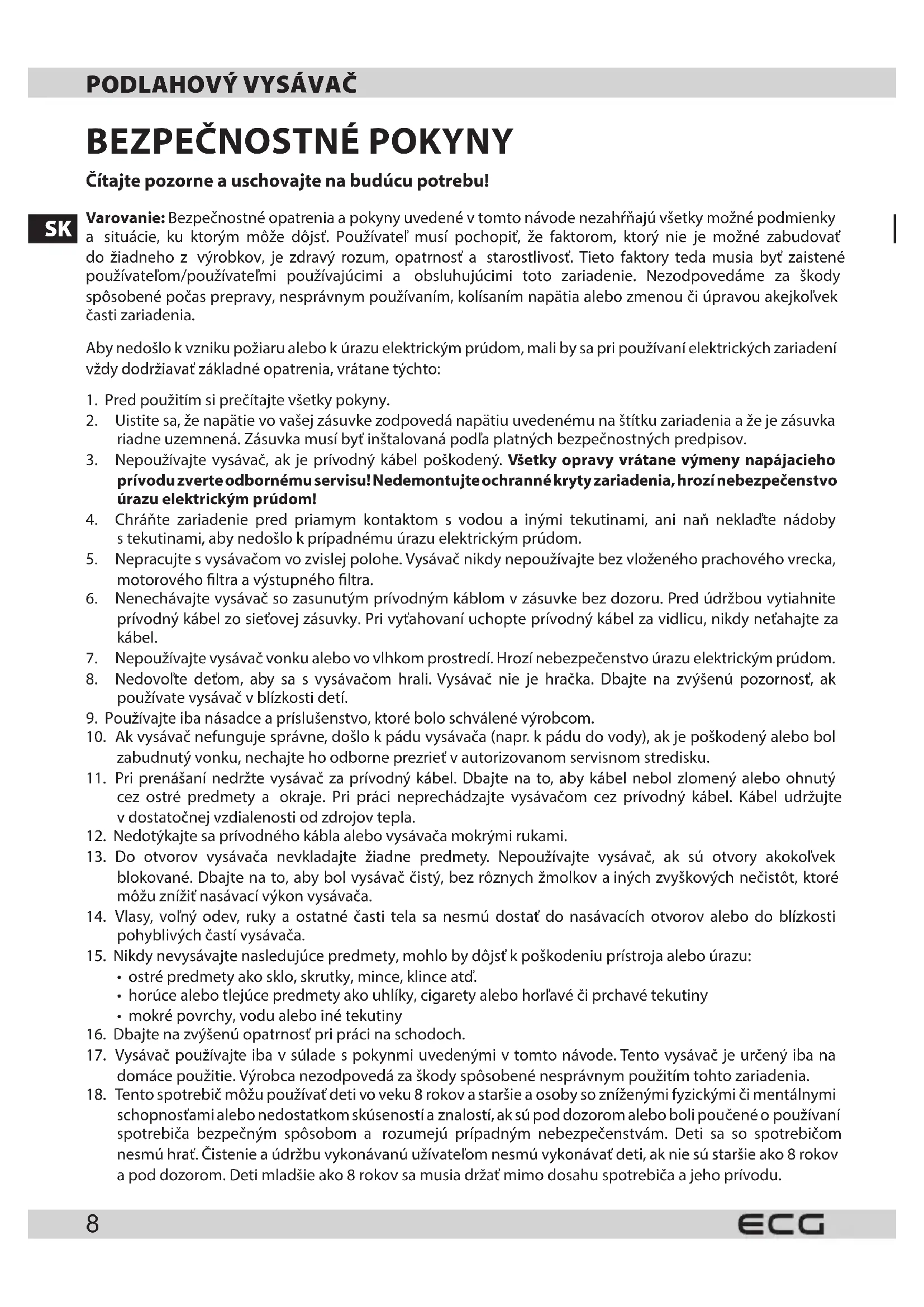 Baliaci papier avlnitá lepenka – odovzdajte do zberných surovín. Prebalová fólia, PE vrecká, plastové diely – vyhadzujte do kontajnerov na plasty. LIKVIDÁCIA VÝROBKU PO SKONČENÍ ŽIVOTNOSTI Likvidácia použitých elektrických aelektronických zariadení (platí včlenských krajinách EÚ aďalších európskych krajinách so zavedeným systémom triedenia odpadu)Vyobrazený symbol na produkte alebo na obale znamená, že sproduktom by sa nemalo nakladať ako sdomovým odpadom. Produkt odovzdajte na miesto určené na recykláciu elektrických aelektronických zariadení. Správnou likvidáciou produktu zabránite negatívnym vplyvom na ľudské zdravie a životné prostredie. Recyklácia materiálov prispieva kochrane prírodných zdrojov. Viac informácií orecyklácii tohto produktu vám poskytne obecný úrad, organizácia na spracovanie domového odpadu alebo predajné miesto, kde ste produkt kúpili. Tento výrobok spĺňa požiadavky smerníc EÚ o elektromagnetickej kompatibilite a elektrickej bezpečnosti. Návod na obsluhu je k dispozícii na webových stránkach www.ecg.sk. Zmena textu a technických parametrov vyhradená.