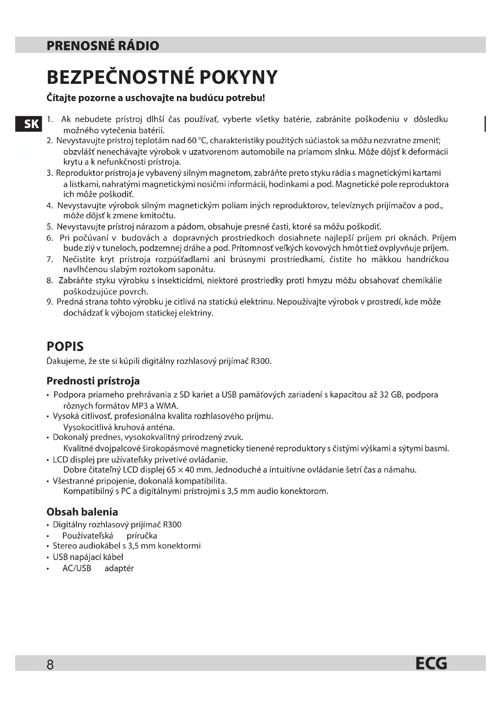Čítajte pozorne auschovajte na budúcu potrebu! 1. Ak nebudete prístroj dlhší čas používať, vyberte všetky batérie, zabránite poškodeniu v dôsledku možného vytečenia batérií.2. Nevystavujte prístroj teplotám nad 60 °C, charakteristiky použitých súčiastok sa môžu nezvratne zmeniť; obzvlášť nenechávajte výrobok vuzatvorenom automobile na priamom slnku. Môže dôjsť kdeformácii krytu ak nefunkčnosti prístroja.3. Reproduktor prístroja je vybavený silným magnetom, zabráňte preto styku rádia smagnetickými kartami alístkami, nahratými magnetickými nosičmi informácií, hodinkami apod. Magnetické pole reproduktora ich môže poškodiť.4. Nevystavujte výrobok silným magnetickým poliam iných reproduktorov, televíznych prijímačov apod., môže dôjsť kzmene kmitočtu.5. Nevystavujte prístroj nárazom apádom, obsahuje presné časti, ktoré sa môžu poškodiť.6. Pri počúvaní v budovách a dopravných prostriedkoch dosiahnete najlepší príjem pri oknách. Príjem bude zlý vtuneloch, podzemnej dráhe apod. Prítomnosť veľkých kovových hmôt tiež ovplyvňuje príjem.7. Nečistite kryt prístroja rozpúšťadlami ani brúsnymi prostriedkami, čistite ho mäkkou handričkou navlhčenou slabým roztokom saponátu.8. Zabráňte styku výrobku sinsekticídmi, niektoré prostriedky proti hmyzu môžu obsahovať chemikálie poškodzujúce povrch.9. Predná strana tohto výrobku je citlivá na statickú elektrinu. Nepoužívajte výrobok vprostredí, kde môže dochádzať kvýbojom statickej elektriny. POPIS Ďakujeme, že ste si kúpili digitálny rozhlasový prijímač R300. Prednosti prístroja