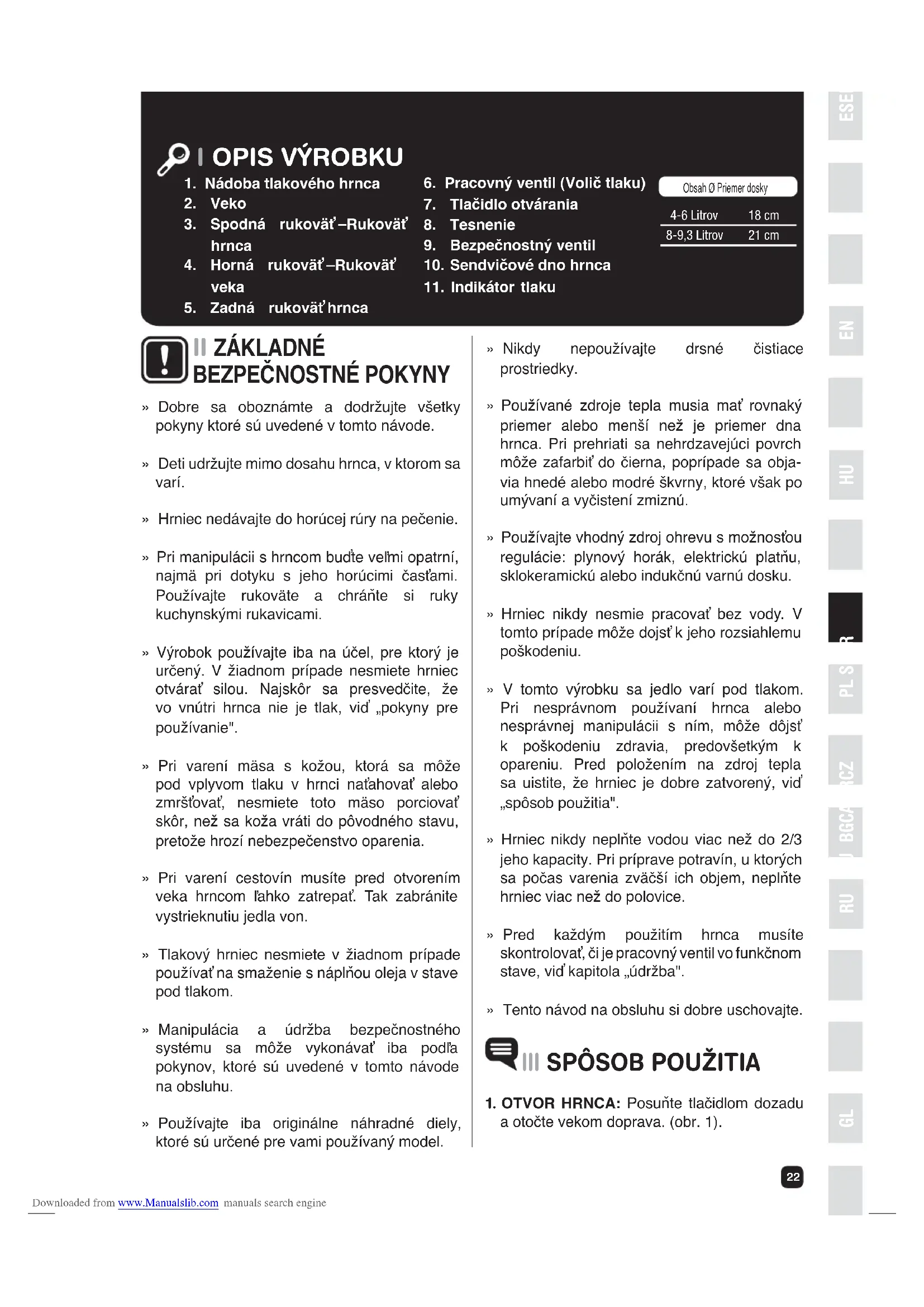 a otočte vekom doprava. (obr. 1). Obsah Ø Priemer dosky 4-6 Litrov 8-9,3 Litrov 18 cm 21 cm » Dobre sa oboznámte a dodržujte všetky pokyny ktoré sú uvedené v tomto návode. » Deti udržujte mimo dosahu hrnca, v ktorom sa varí. » Hrniec nedávajte do horúcej rúry na pečenie. » Pri manipulácii s hrncom buďte veľmi opatrní, najmä pri dotyku s jeho horúcimi časťami. Používajte rukoväte a chráňte si ruky kuchynskými rukavicami. » Výrobok používajte iba na účel, pre ktorý je určený. V žiadnom prípade nesmiete hrniec otvárať silou. Najskôr sa presvedčite, že vo vnútri hrnca nie je tlak, viď „pokyny pre používanie". » Pri varení mäsa s kožou, ktorá sa môže pod vplyvom tlaku v hrnci naťahovať alebo zmršťovať, nesmiete toto mäso porciovať skôr, než sa koža vráti do pôvodného stavu, pretože hrozí nebezpečenstvo oparenia. » Pri varení cestovín musíte pred otvorením veka hrncom ľahko zatrepať. Tak zabránite vystrieknutiu jedla von. » Tlakový hrniec nesmiete v žiadnom prípade používať na smaženie s náplňou oleja v stave pod tlakom. » Manipulácia a údržba bezpečnostného systému sa môže vykonávať iba podľa pokynov, ktoré sú uvedené v tomto návode na obsluhu. » Používajte iba originálne náhradné diely, ktoré sú určené pre vami používaný model.