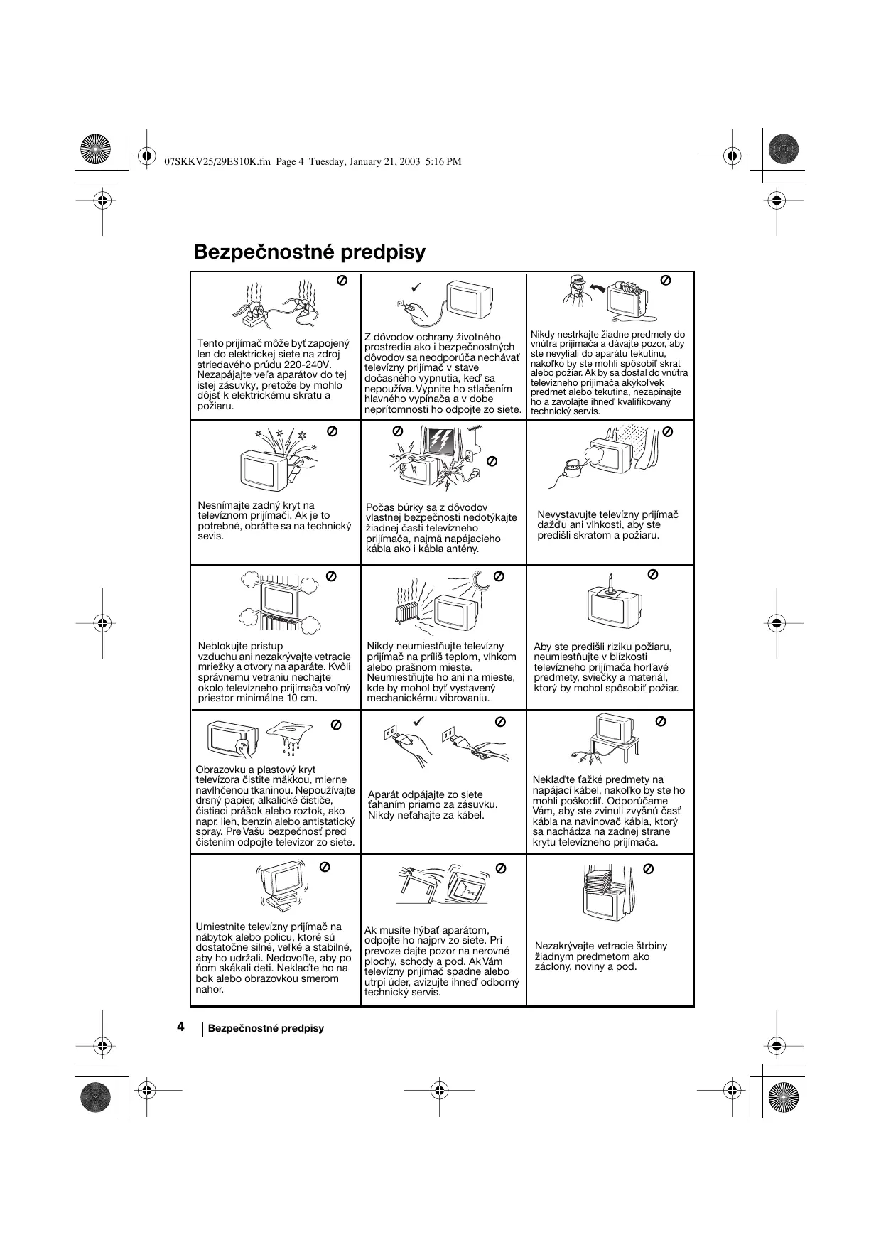 07SKKV25/29ES10K.fm Page 4 Tuesday, January 21, 2003 5:16 PM Bezpečnostné predpisy Z dôvodov ochrany životného prostredia ako i bezpečnostných dôvodov sa neodporúča nechávať televízny prijímač v stave dočasného vypnutia, keď sa nepoužíva. Vypnite ho stlačením hlavného vypínača a v dobe neprítomnosti ho odpojte zo siete. Nikdy nestrkajte žiadne predmety do vnútra prijímača a dávajte pozor, aby ste nevyliali do aparátu tekutinu, nakoľko by ste mohli spôsobiť skrat alebo požiar. Ak by sa dostal do vnútra televízneho prijímača akýkoľvek predmet alebo tekutina, nezapínajte ho a zavolajte ihneď kvalifikovaný technický servis. Nesnímajte zadný kryt na televíznom prijímači. Ak je to potrebné, obráťte sa na technický sevis. Počas búrky sa z dôvodov vlastnej bezpečnosti nedotýkajte žiadnej časti televízneho prijímača, najmä napájacieho kábla ako i kábla antény. Nevystavujte televízny prijímač dažďu ani vlhkosti, aby ste predišli skratom a požiaru. Neblokujte prístup vzduchu ani nezakrývajte vetracie mriežky a otvory na aparáte. Kvôli správnemu vetraniu nechajte okolo televízneho prijímača voľný priestor minimálne 10 cm. Nikdy neumiestňujte televízny prijímač na príliš teplom, vlhkom alebo prašnom mieste. Neumiestňujte ho ani na mieste, kde by mohol byť vystavený mechanickému vibrovaniu. Aby ste predišli riziku požiaru, neumiestňujte v blízkosti televízneho prijímača horľavé predmety, sviečky a materiál, ktorý by mohol spôsobiť požiar. Obrazovku a plastový kryt televízora čistite mäkkou, mierne navlhčenou tkaninou. Nepoužívajte drsný papier, alkalické čističe, čistiaci prášok alebo roztok, ako napr. lieh, benzín alebo antistatický spray. Pre Vašu bezpečnosť pred čistením odpojte televízor zo siete. Aparát odpájajte zo siete ťahaním priamo za zásuvku. Nikdy neťahajte za kábel. Tento prijímač môže byť zapojený len do elektrickej siete na zdroj striedavého prúdu 220-240V. Nezapájajte veľa aparátov do tej istej zásuvky, pretože by mohlo dôjsť k elektrickému skratu a požiaru. Umiestnite televízny prijímač na nábytok alebo policu, ktoré sú dostatočne silné, veľké a stabilné, aby ho udržali. Nedovoľte, aby po ňom skákali deti. Neklaďte ho na bok alebo obrazovkou smerom nahor.