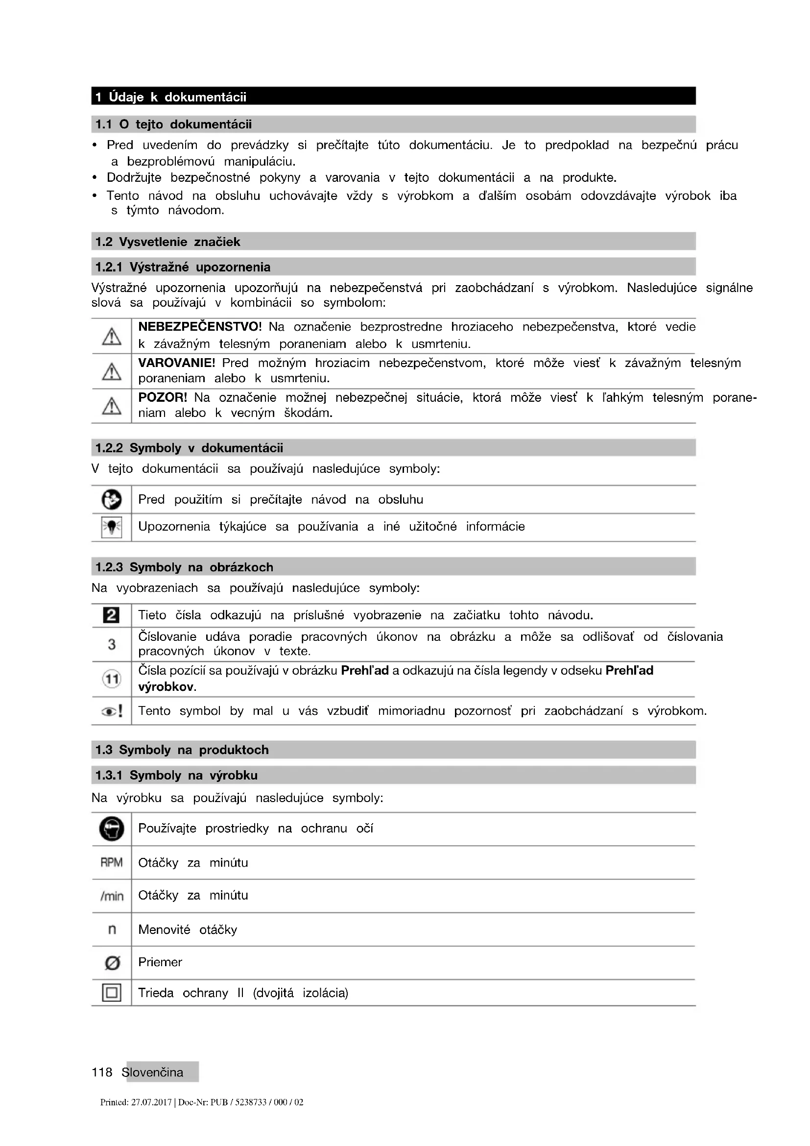 Na výrobku sa používajú nasledujúce symboly: Používajte prostriedky na ochranu očí Otáčky za minútu Otáčky za minútu Menovité otáčky Priemer Trieda ochrany II (dvojitá izolácia) Printed: 27.07.2017 | Doc-Nr: PUB / 5238733 / 000 / 02Slovenčina 119