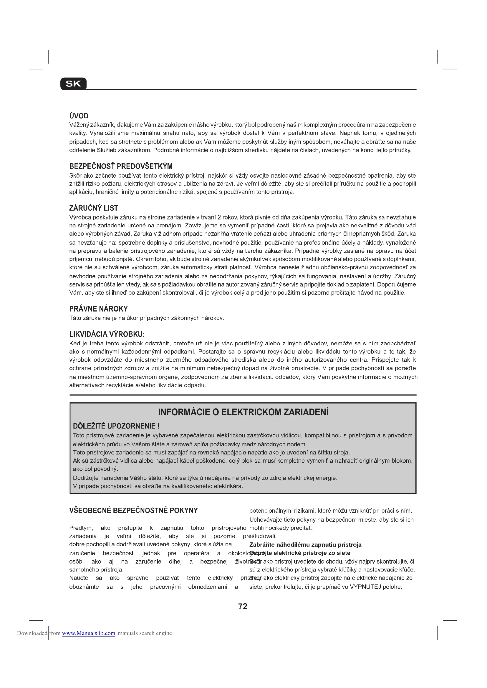 DÔLEŽITÉ UPOZORNENIE ! Totoprístrojovézariadeniejevybavenézapečatenouelektrickouzástrčkovouvidlicou,kompatibilnousprístrojomasprívodom elektrickéhoprúduvoVašomštáteazároveňspĺňapožiadavkymedzinárodnýchnoriem. Totoprístrojovézariadeniesamusízapájaťnarovnakénapájacienapätieakojeuvedenínaštítkustroja. Aksúzástrčkovávidlicaalebonapájacíkábelpoškodené,celýbloksamusíkompletnevymeniťanahradiťoriginálnymblokom, akobolpôvodný. DodržujtenariadeniaVášhoštátu,ktorésatýkajúnapájanianaprívodyzozdrojaelektrickejenergie. Vprípadepochybnostísaobráťtenakvalifikovanéhoelektrikára. ÚVOD Váženýzákazník,ďakujemeVámzazakúpenienášhovýrobku,ktorýbolpodrobenýnašimkomplexnýmprocedúramnazabezpečenie kvality. Vynaložili sme maximálnu snahu nato, aby sa výrobok dostal k Vám v perfektnom stave. Napriek tomu, v ojedinelých prípadoch,keďsastretnetesproblémomaleboakVámmôžemeposkytnúťslužbyinýmspôsobom,neváhajteaobráťtesananaše oddelenieSlužiebzákazníkom.Podrobnéinformácieonajbližšomstrediskunájdetenačíslach,uvedenýchnakoncitejtopríručky.