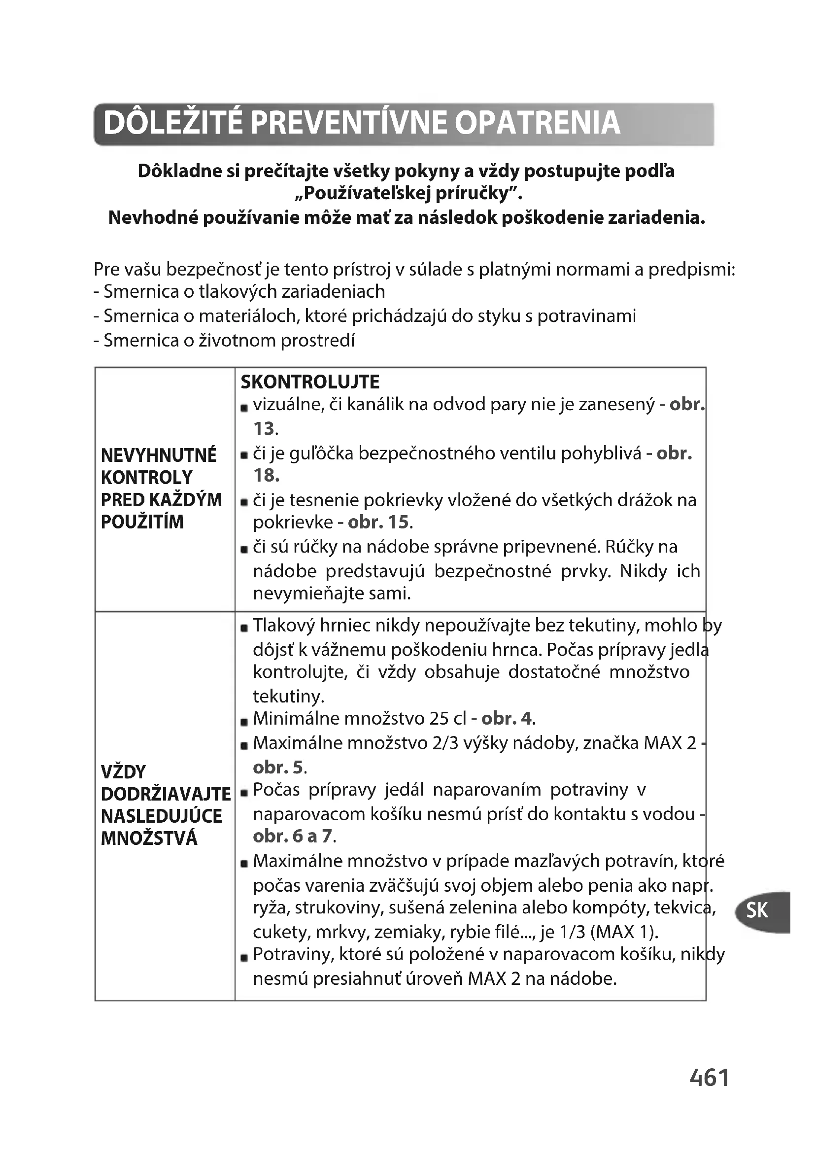 či je tesnenie pokrievky vložené do všetkých drážok na pokrievke - obr. 15. či sú rúčky na nádobe správne pripevnené. Rúčky na nádobe predstavujú bezpečnostné prvky. Nikdy ich nevymieňajte sami. VŽDY DODRŽIAVAJTE NASLEDUJÚCE MNOŽSTVÁ Tlakový hrniec nikdy nepoužívajte bez tekutiny, mohlo by dôjsť k vážnemu poškodeniu hrnca. Počas prípravy jedla kontrolujte, či vždy obsahuje dostatočné množstvo tekutiny. Minimálne množstvo 25 cl - obr. 4. Maximálne množstvo 2/3 výšky nádoby, značka MAX 2 - obr. 5. Počas prípravy jedál naparovaním potraviny v naparovacom košíku nesmú prísť do kontaktu s vodou - obr. 6 a 7. Maximálne množstvo v prípade mazľavých potravín, ktoré počas varenia zväčšujú svoj objem alebo penia ako napr. ryža, strukoviny, sušená zelenina alebo kompóty, tekvica, cukety, mrkvy, zemiaky, rybie filé..., je 1/3 (MAX 1). Potraviny, ktoré sú položené v naparovacom košíku, nikdy nesmú presiahnuť úroveň MAX 2 na nádobe.462