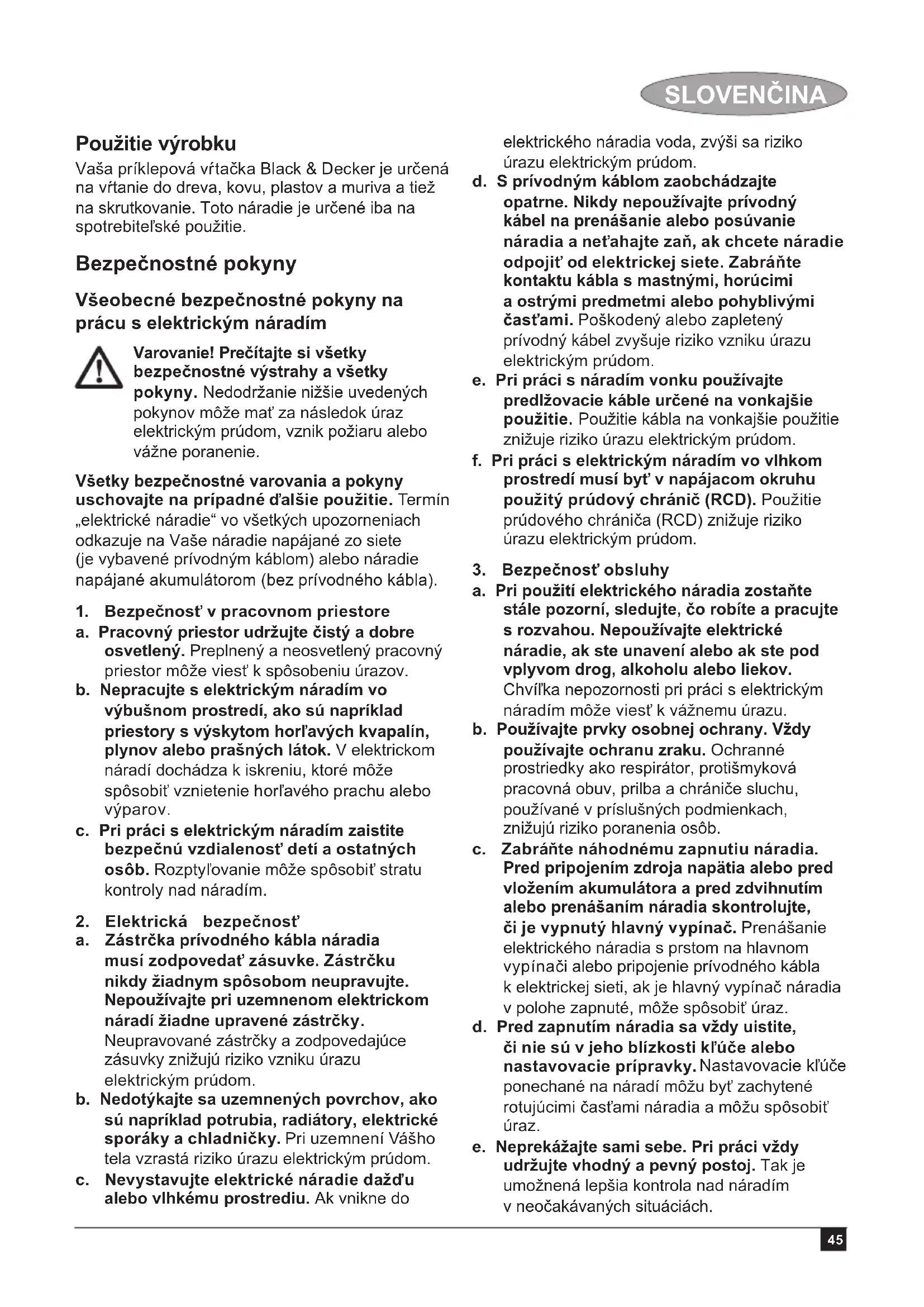 zawiesza uprawnień kupującego wynikających z niezgodności towaru z umową. Centralny Serwis Gwarancyjny ERPATECH ul. Bakaliowa 26, 05-080 Mościska tel.: (22) 862-08-08, (22) 431-05-05 faks: (22) 862-08-0945 SLOVENČINA Použitie výrobku Vaša príklepová vŕtačka Black & Decker je určená na vŕtanie do dreva, kovu, plastov a muriva a tiež na skrutkovanie. Toto náradie je určené iba na spotrebiteľské použitie. Bezpečnostné pokyny Všeobecné bezpečnostné pokyny na prácu s elektrickým náradím Varovanie! Prečítajte si všetky bezpečnostné výstrahy a všetky pokyny. Nedodržanie nižšie uvedených pokynov môže mať za následok úraz elektrickým prúdom, vznik požiaru alebo vážne poranenie. Všetky bezpečnostné varovania a pokyny uschovajte na prípadné ďalšie použitie. Termín „elektrické náradie“ vo všetkých upozorneniach odkazuje na Vaše náradie napájané zo siete (je vybavené prívodným káblom) alebo náradie napájané akumulátorom (bez prívodného kábla).