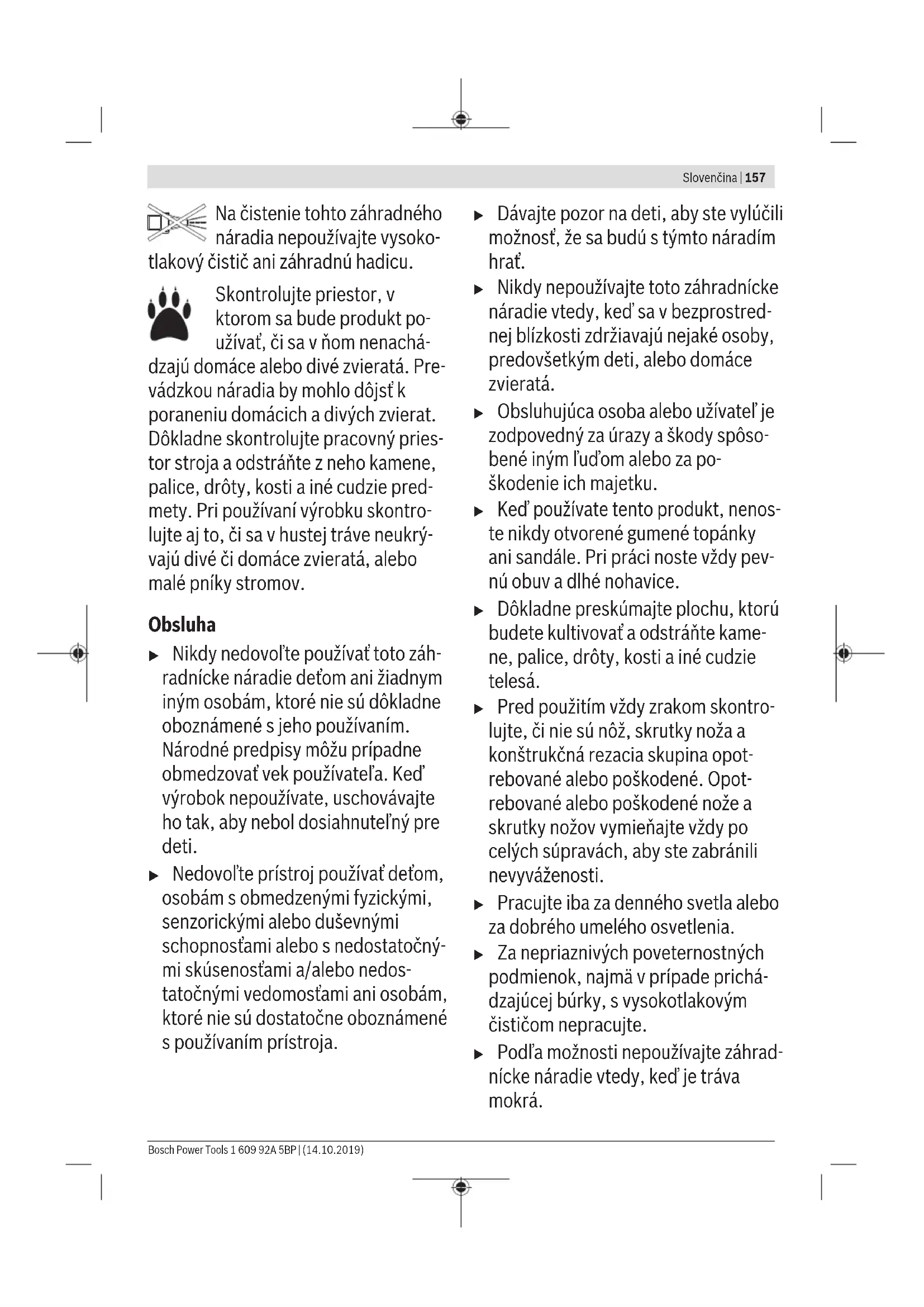 Pro prodloužení doby chodu lze zakoupit v autorizovaném servisním středisku pro zahradní nářadí Bosch dodatečný akumulátor. Hledání závad Příznak Možná příčina Odstranění Motor se nerozeběhne Vadná vnitřní kabeláž zahradního nářadí Obraťte se na zákaznický servis Bosch Vybitý akumulátor Nabijte akumulátor Příliš studený/horký akumulátor Akumulátor nechte ohřát/ochladit Příliš dlouhá tráva Max. přípustná výška trávy je 30 cm s největším nastavením výšky sečení Projevila se motorová ochrana Motor nechte vychladnout a nastavte větší výšku sečení Přerušovač okruhu el. proudu není správně / není zcela vložený Vložte správně Zahradní nářadí běží přerušovaně Vadná vnitřní kabeláž zahradního nářadí Obraťte se na zákaznický servis Bosch Projevila se motorová ochrana Motor nechte vychladnout a nastavte větší výšku sečení Zahradní nářadí zanechává nepravidelný obraz sečení a / nebo motor pracuje těžce Příliš nízká výška sečení Nastavte větší výšku sečení Tupý nůž Nůž vyměňte (viz obrázek J) Možné ucpání Zahradní nářadí vypněte a rozpojte přerušovač okruhu el. proudu Zkontrolujte a popř. uvolněte spodní stranu zahradního nářadí (noste vždy zahradní rukavice) Nesprávně dokola namontovaný nůž Nůž namontujte dokola správně 1 609 92A 5BP | (14.10.2019) Bosch Power ToolsČeština | 155 Příznak Možná příčina Odstranění Po zapnutí zahradního nářadí se nůž netočí Noži překáží tráva Zahradní nářadí vypněte a rozpojte přerušovač okruhu el. proudu Odstraňte ucpání (noste vždy zahradní rukavice) Uvolněná matice/šroub nože Matici/šroub nože utáhněte (27Nm) Silné vibrace/hluk Uvolněná matice/šroub nože Matici/šroub nože utáhněte (27Nm) Poškozený nůž Nůž vyměňte (viz obrázek J) Akumulátor a nabíječka Příznaky Možná příčina Odstranění Bliká červený ukazatel nabíjení akumulátoru na nabíječce Nabíjecí proces není možný Akumulátor není (správně) nasazený Nasaďte akumulátor správně do nabíječky Znečištěné kontakty akumulátoru Kontakty akumulátoru očistěte; např. několikerým zasunutím a vytažením akumulátoru, popř. akumulátor nahraďte Vadný akumulátor Akumulátor nahraďte Ukazatelé nabíjení akumulátoru na nabíječce nesvítí Síťová zástrčka nabíječky není (správně) zastrčena Síťovou zástrčku (zcela) zastrčte do zásuvky Zásuvka, síťový kabel nebo nabíječka mají závadu Zkontrolujte síťové napětí, nabíječku příp. nechte zkontrolovat autorizovaným servisním střediskem pro elektronářadí Bosch Údržba a servis Péče o akumulátor u Výstraha! Dříve, než provedete práce údržby nebo čištění, zahradní nářadí vypněte, rozpojte přerušovač okruhu el. proudu a odstraňte akumulátor a též sběrný vak na trávu. u Když manipulujete nebo pracujete v oblasti ostrých nožů, vždy noste zahradní rukavice. Pro zaručení optimálního používání akumulátoru dbejte následujících upozornění a opatření: – Chraňte akumulátor před vlhkostí a vodou. – Zahradní nářadí a akumulátor skladujte pouze v teplotním rozsahu od –20 °C do 50 °C. Nenechávejte zahradní nářadí např. v létě ležet v autě. – Akumulátor uskladněte odděleně a nikoli v nabíječce. – Při přímém slunečním záření nenechávejte akumulátor v zahradním nářadí. – Optimální teplota pro uskladnění akumulátoru činí 5 °C. – Příležitostně vyčistěte větrací otvory akumulátoru měkkým, čistým a suchým štětcem. Výrazně zkrácená doba provozu po nabití ukazuje, že je akumulátor opotřebovaný a musí se nahradit. Zákaznická služba aporadenství ohledně použití www.bosch-garden.com U všech dotazů aobjednávek náhradních dílů nezbytně prosím uvádějte 10-místné objednací číslo podle typového štítku výrobku. Czech Republic Robert Bosch odbytová s.r.o. Bosch Service Center PT K Vápence 1621/16 692 01 Mikulov Na www.bosch-pt.cz si si můžete objednat opravu Vašeho stroje nebo náhradní díly online. Tel.: +420 519 305700 Fax: +420 519 305705 E-Mail: servis.naradi@cz.bosch.com www.bosch-pt.cz Přeprava Obsažené lithium-iontové akumulátory podléhají požadavkům zákona o nebezpečných nákladech. Tyto akumulátory mohou byt bez dalších podmínek přepravovány uživatelem po silnici. Při zasílání prostřednictvím třetí osoby (např.: letecká přeprava nebo spedice) je třeba brát zřetel na zvláštní požadavky na balení a označení. Zde musí být při přípravě zásilky nezbytně přizván expert na nebezpečné náklady. Akumulátory zasílejte pouze tehdy, pokud je těleso nepoškozené. Otevřené kontakty přelepte lepicí páskou a akumulátor zabalte tak, aby se v obalu nemohl pohybovat. Dodržujte prosím také případné další národní předpisy. Zpracování odpadů Zahradní nářadí, akumulátory, příslušenství a obaly mají být dodány k opětovnému zhodnocení nepoškozujícímu životní prostředí. Bosch Power Tools 1 609 92A 5BP | (14.10.2019)156 | Slovenčina Nevyhazujte zahradní nářadí a akumulátory/ baterie do domovního odpadu! Pouze pro zeměEU: Podle evropské směrnice 2012/19/EU musejí být neupotřebitelná elektrická a elektronická zařízení a podle evropské směrnice 2006/66/ES vadné nebo opotřebované akumulátory/baterie odděleně shromážděny a dodány k opětovnému zhodnocení nepoškozujícímu životní prostředí. Akumulátory/baterie: Li-ion: Dbejte prosím upozornění v odstavci Přeprava. Slovenčina Bezpečnostné pokyny Pozor! Starostlivo si prečítajte poky- ny uvedené v nasledujúcom texte. Dôkladne sa oboznámte s obslužný- mi prvkami a so správnym používa- ním tohto výrobku. Návod na použí- vanie si l