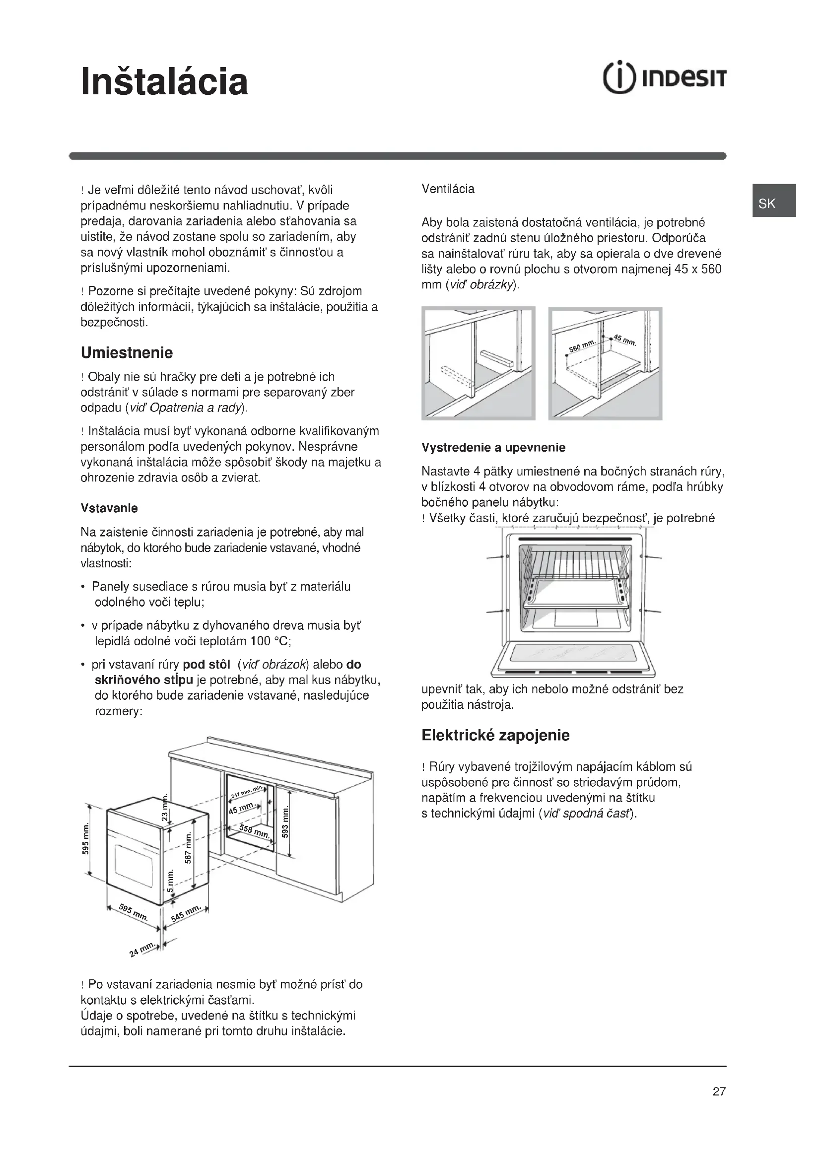 - pri vstavaní rúry pod stôl (vić obrázok) alebo do skriĖového stĎpu je potrebné, aby mal kus nábytku, do ktorého bude zariadenie vstavané, nasledujúce rozmery: ! Po vstavaní zariadenia nesmie byĢ možné prísĢ do kontaktu s elektrickými þasĢami. Údaje o spotrebe, uvedené na štítku s technickými údajmi, boli namerané pri tomto druhu inštalácie. Ventilácia Aby bola zaistená dostatoþná ventilácia, je potrebné odstrániĢ zadnú stenu úložného priestoru. Odporúþa sa nainštalovaĢ rúru tak, aby sa opierala o dve drevené lišty alebo o rovnú plochu s otvorom najmenej 45 x 560 mm (vić obrázky). Vystredenie a upevnenie Nastavte 4 pätky umiestnené na boþných stranách rúry, v blízkosti 4 otvorov na obvodovom ráme, podĐa hrúbky boþného panelu nábytku: ! Všetky þ asti, ktoré zaruþujú bezpeþnosĢ, je potrebné upevniĢ tak, aby ich nebolo možné odstrániĢ bez použitia nástroja. Elektrické zapojenie ! Rúry vybavené trojžilovým napájacím káblom sú uspôsobené pre þinnosĢ so striedavým prúdom, napätím a frekvenciou uvedenými na štítku s technickými údajmi (vić spodná þasĢ). 595 mm.595 mm.24 mm.545 mm.5 mm.567 mm.23 mm.593 mm.45 mm 558 mm. 547 mm. min. 560 mm. 45 mm.28