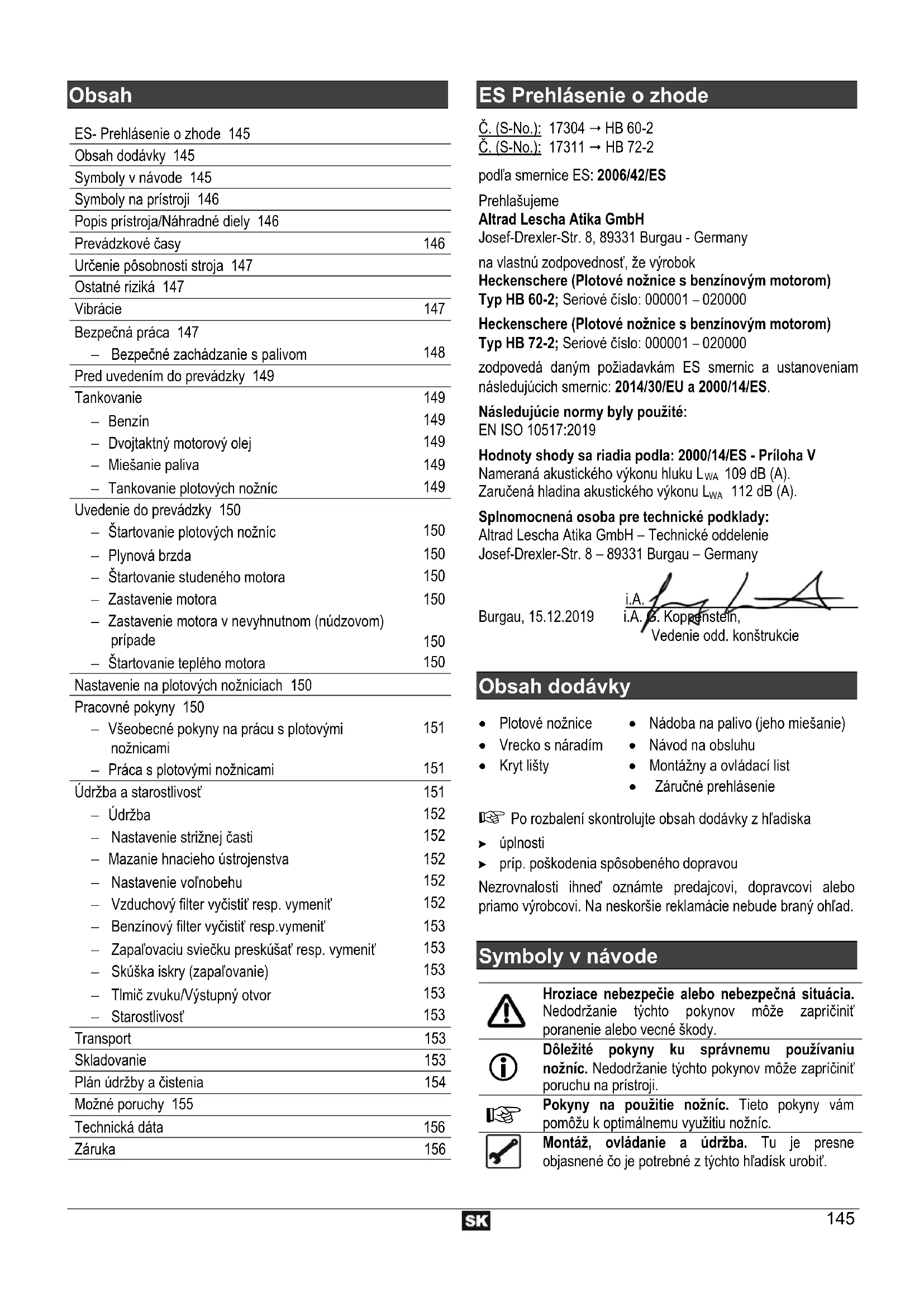 ES Prehlásenie o zhode Č. (S-No.): 17304 HB 60-2 Č. (S-No.): 17311 HB 72-2 podľa smernice ES: 2006/42/ES Prehlašujeme Altrad Lescha Atika GmbH Josef-Drexler-Str. 8, 89331 Burgau - Germany na vlastnú zodpovednosť, že výrobok Heckenschere (Plotové nožnice s benzínovým motorom) Typ HB 60-2; Seriové číslo: 000001 – 020000 Heckenschere (Plotové nožnice s benzínovým motorom) Typ HB 72-2; Seriové číslo: 000001 – 020000 zodpovedá daným požiadavkám ES smernic a ustanoveniam následujúcich smernic: 2014/30/EU a 2000/14/ES. Následujúcie normy byly použité: EN ISO 10517:2019 Hodnoty shody sa riadia podla: 2000/14/ES - Príloha V Nameraná akustického výkonu hluku L