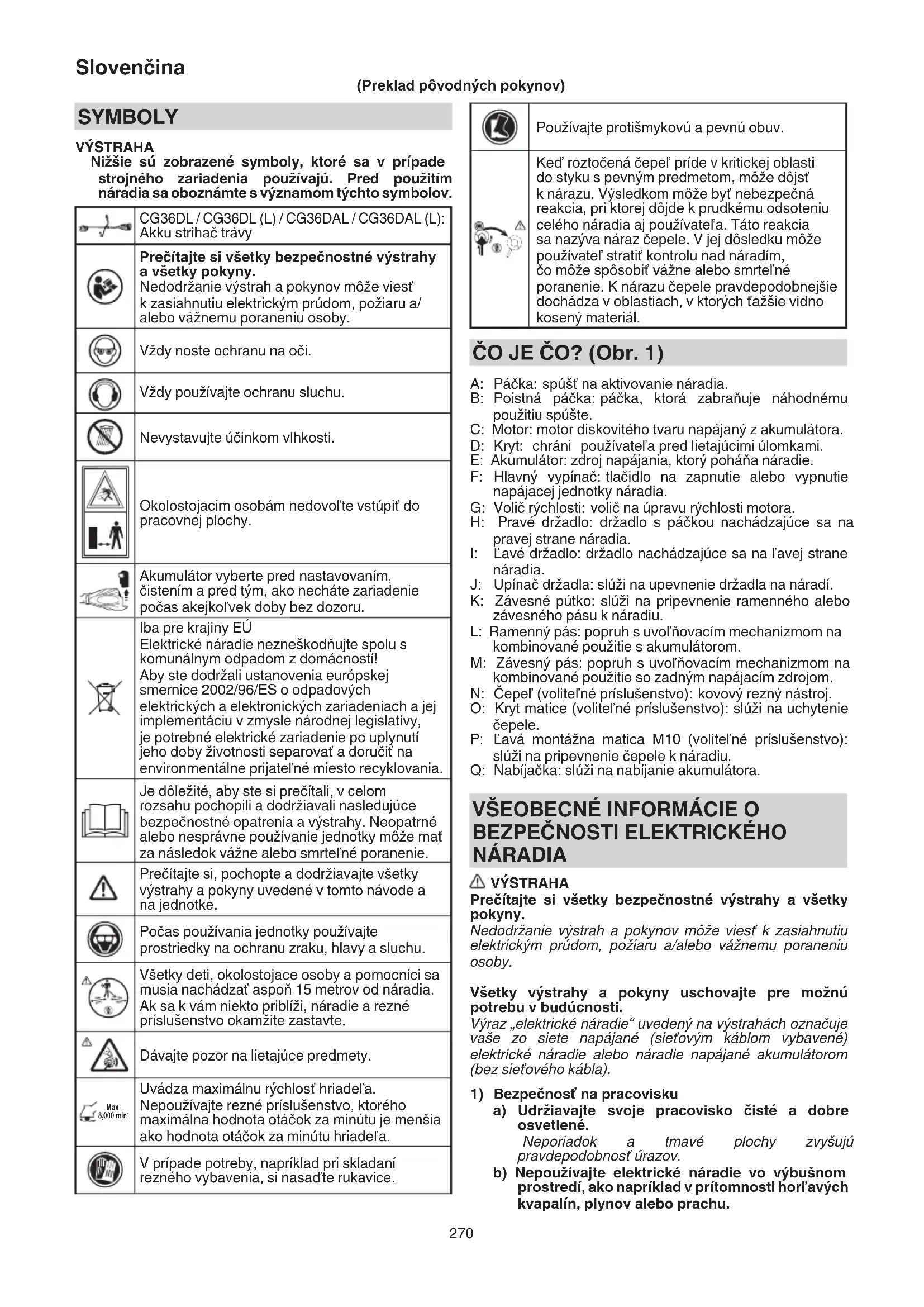 Skupna vrednost vbracij je bila merjena v skladu s standardno testno metodo in se lahko uporablja za primerjavo enega orodja z drugim. Uporablja se lahko tudi kot prvotna ocenitev izpostavljenosti. OPOZORILO ○ Emisija vibracij med dejansko uporabo električnega orodja se lahko razlikuje od navedene vrednosti - odvisno od načina uporabe orodja. ○ Prepoznajte varnostne ukrepe za zaščito uporabnika, ki temeljijo na oceni izpostavljanja v dejanskih pogojih uporabe (pri upoštevanju vseh delov obratovalnega ciklusa, kot so obdobja, ko je orodje izključeno, in ko orodje teče v prostem teku, poleg časa sproženja). 000BookCG36DL.indb269000BookCG36DL.indb269 2016/03/0110:25:512016/03/0110:25:51270 Slovenčina Používajte protišmykovú a pevnú obuv. Keď roztočená čepeľ príde v kritickej oblasti do styku s pevným predmetom, môže dôjsť k nárazu. Výsledkom môže byť nebezpečná reakcia, pri ktorej dôjde k prudkému odsoteniu celého náradia aj používateľa. Táto reakcia sa nazýva náraz čepele. V jej dôsledku môže používateľ stratiť kontrolu nad náradím, čo môže spôsobiť vážne alebo smrteľné poranenie. K nárazu čepele pravdepodobnejšie dochádza v oblastiach, v ktorých ťažšie vidno kosený materiál. ČO JE ČO? (Obr. 1) A: Páčka: spúšť na aktivovanie náradia. B: Poistná páčka: páčka, ktorá zabraňuje náhodnému použitiu spúšte. C: Motor: motor diskovitého tvaru napájaný z akumulátora. D: Kryt: chráni používateľa pred lietajúcimi úlomkami. E: Akumulátor: zdroj napájania, ktorý poháňa náradie. F: Hlavný vypínač: tlačidlo na zapnutie alebo vypnutie napájacej jednotky náradia. G: Volič rýchlosti: volič na úpravu rýchlosti motora. H: Pravé držadlo: držadlo s páčkou nachádzajúce sa na pravej strane náradia. I: Ľavé držadlo: držadlo nachádzajúce sa na ľavej strane náradia. J: Upínač držadla: slúži na upevnenie držadla na náradí. K: Závesné pútko: slúži na pripevnenie ramenného alebo závesného pásu k náradiu. L: Ramenný pás: popruh s uvoľňovacím mechanizmom na kombinované použitie s akumulátorom. M: Závesný pás: popruh s uvoľňovacím mechanizmom na kombinované použitie so zadným napájacím zdrojom. N: Čepeľ (voliteľné príslušenstvo): kovový rezný nástroj. O: Kryt matice (voliteľné príslušenstvo): slúži na uchytenie čepele. P: Ľavá montážna matica M10 (voliteľné príslušenstvo): slúži na pripevnenie čepele k náradiu. Q: Nabíjačka: slúži na nabíjanie akumulátora.