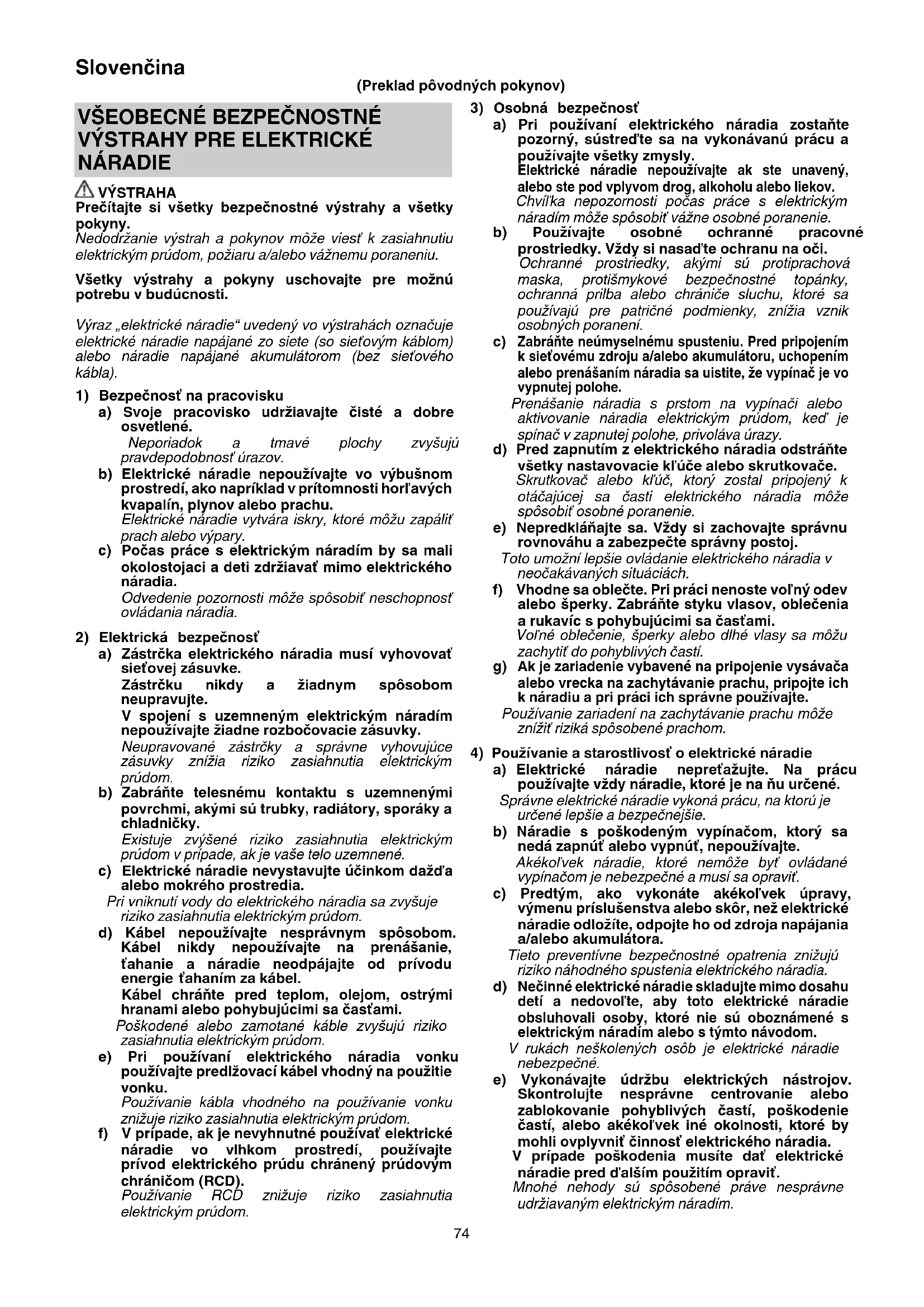 NÁRADIE VÝSTRAHA Prečítajte si všetky bezpečnostné výstrahy a všetky pokyny. Nedodržanie výstrah a pokynov môže viesť k zasiahnutiu elektrickým prúdom, požiaru a/alebo vážnemu poraneniu. Všetky výstrahy a pokyny uschovajte pre možnú potrebu v budúcnosti. Výraz „elektrické náradie“ uvedený vo výstrahách označuje elektrické náradie napájané zo siete (so sieťovým káblom) alebo náradie napájané akumulátorom (bez sieťového kábla).