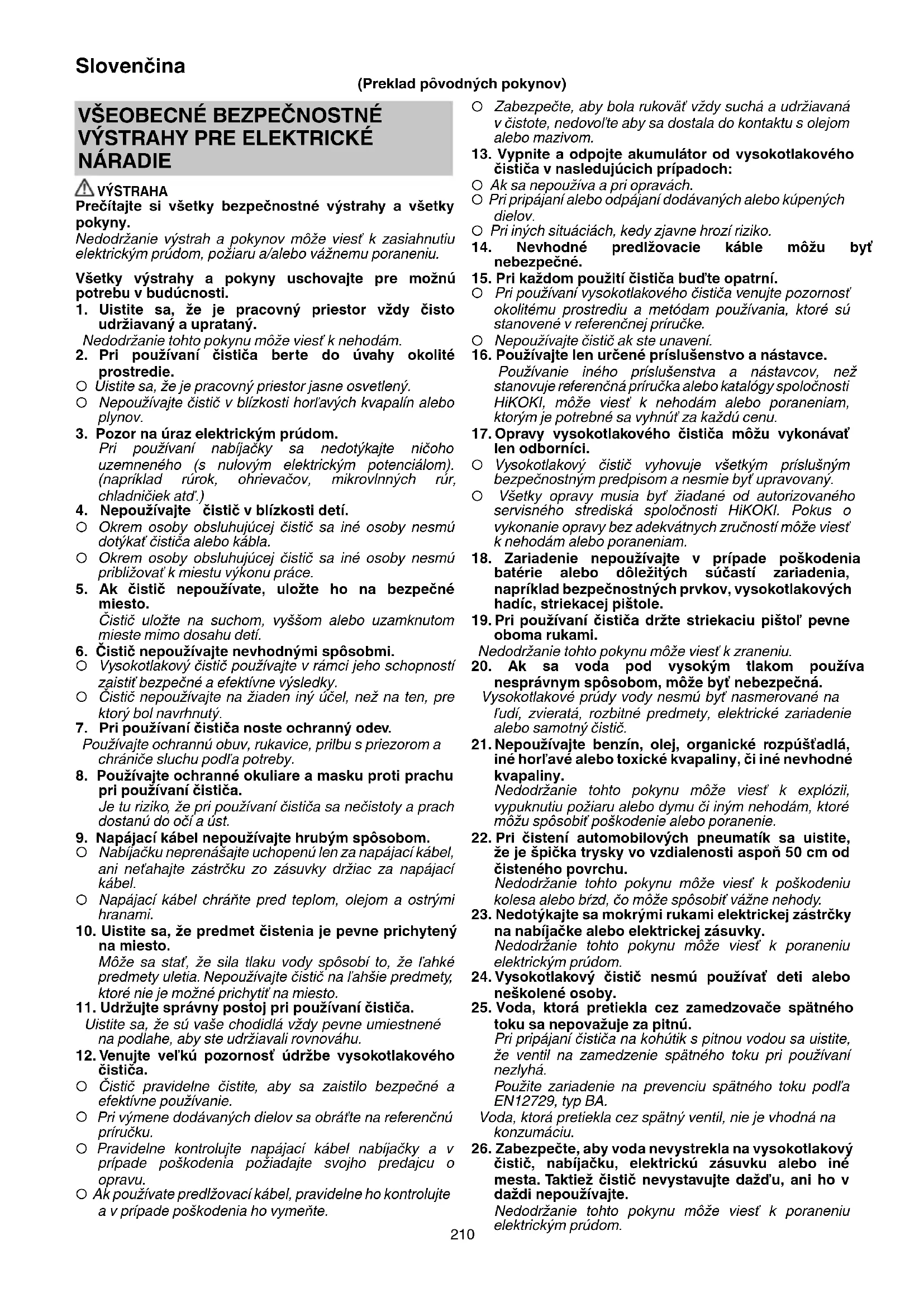 len odborníci. ○ Vysokotlakový čistič vyhovuje všetkým príslušným bezpečnostným predpisom a nesmie byť upravovaný. ○ Všetky opravy musia byť žiadané od autorizovaného servisného strediská spoločnosti HiKOKI. Pokus o vykonanie opravy bez adekvátnych zruč ností môže viesť k nehodám alebo poraneniam.