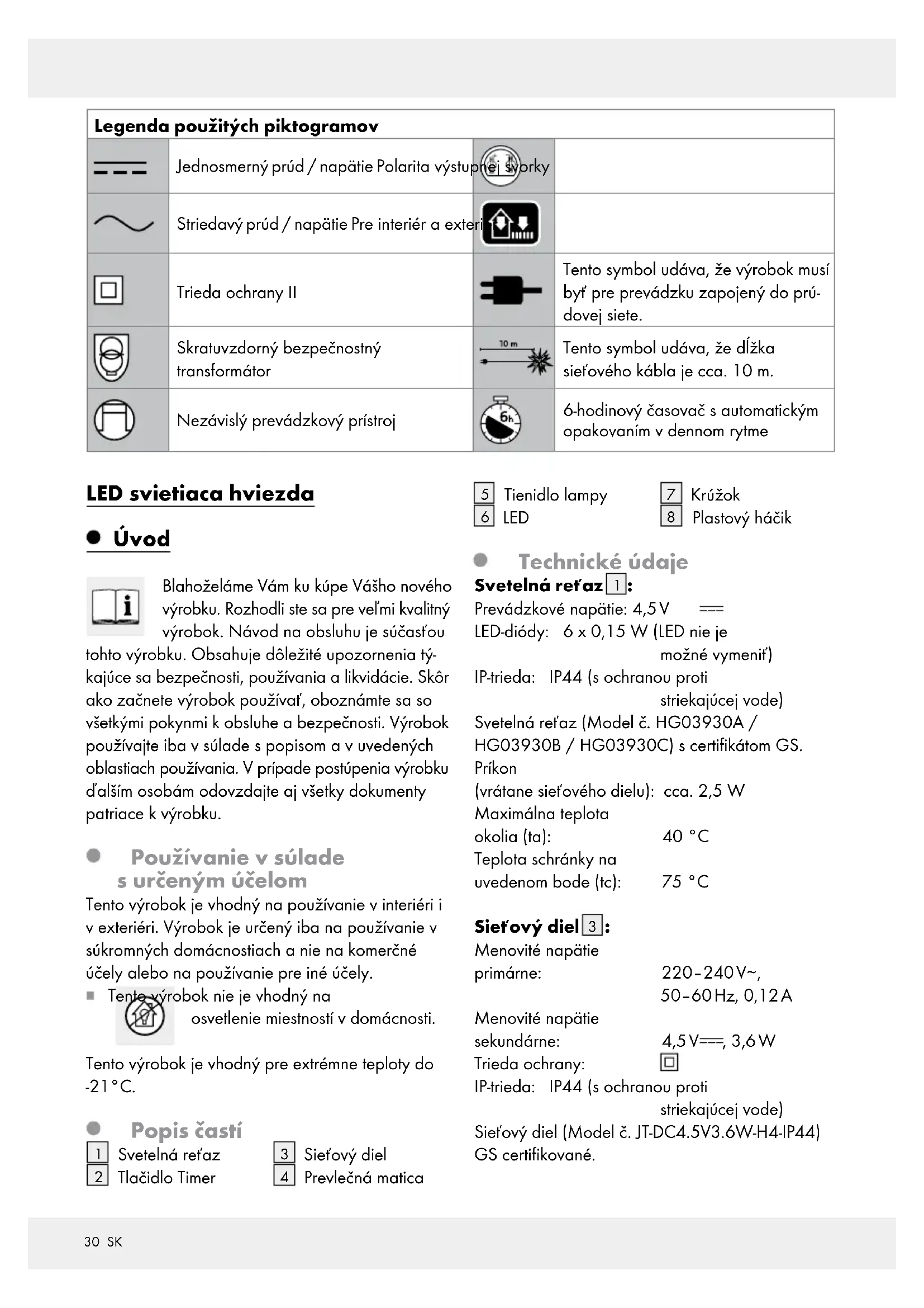 Prevádzkové napätie: 4,5 V LED-diódy: 6 x 0,15 W (LED nie je možné vymeniť) IP-trieda: IP44 (s ochranou proti striekajúcej vode) Svetelná reťaz (Model č. HG03930A / HG03930B / HG03930C) s certifikátom GS. Príkon (vrátane sieťového dielu): cca. 2,5 W Maximálna teplota okolia (ta): 40 °C Teplota schránky na uvedenom bode (tc): 75 °C Sieťový diel
