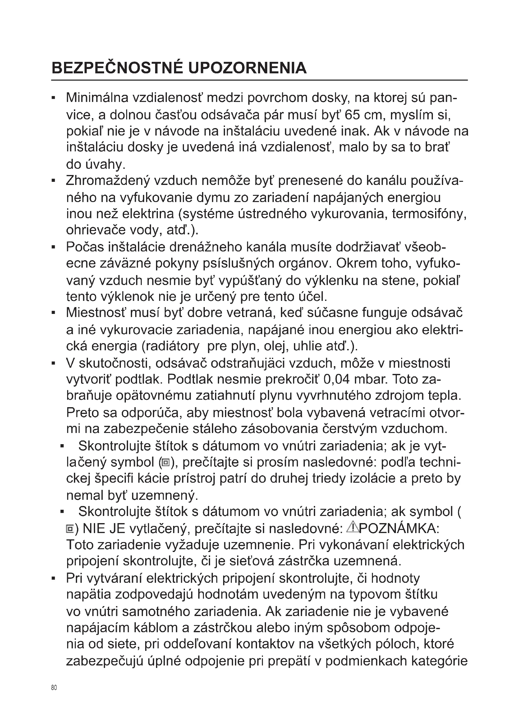- Miestnosť musí byť dobre vetraná, keď súčasne funguje odsávač a iné vykurovacie zariadenia, napájané inou energiou ako elektri- cká energia (radiátory pre plyn, olej, uhlie atď.).