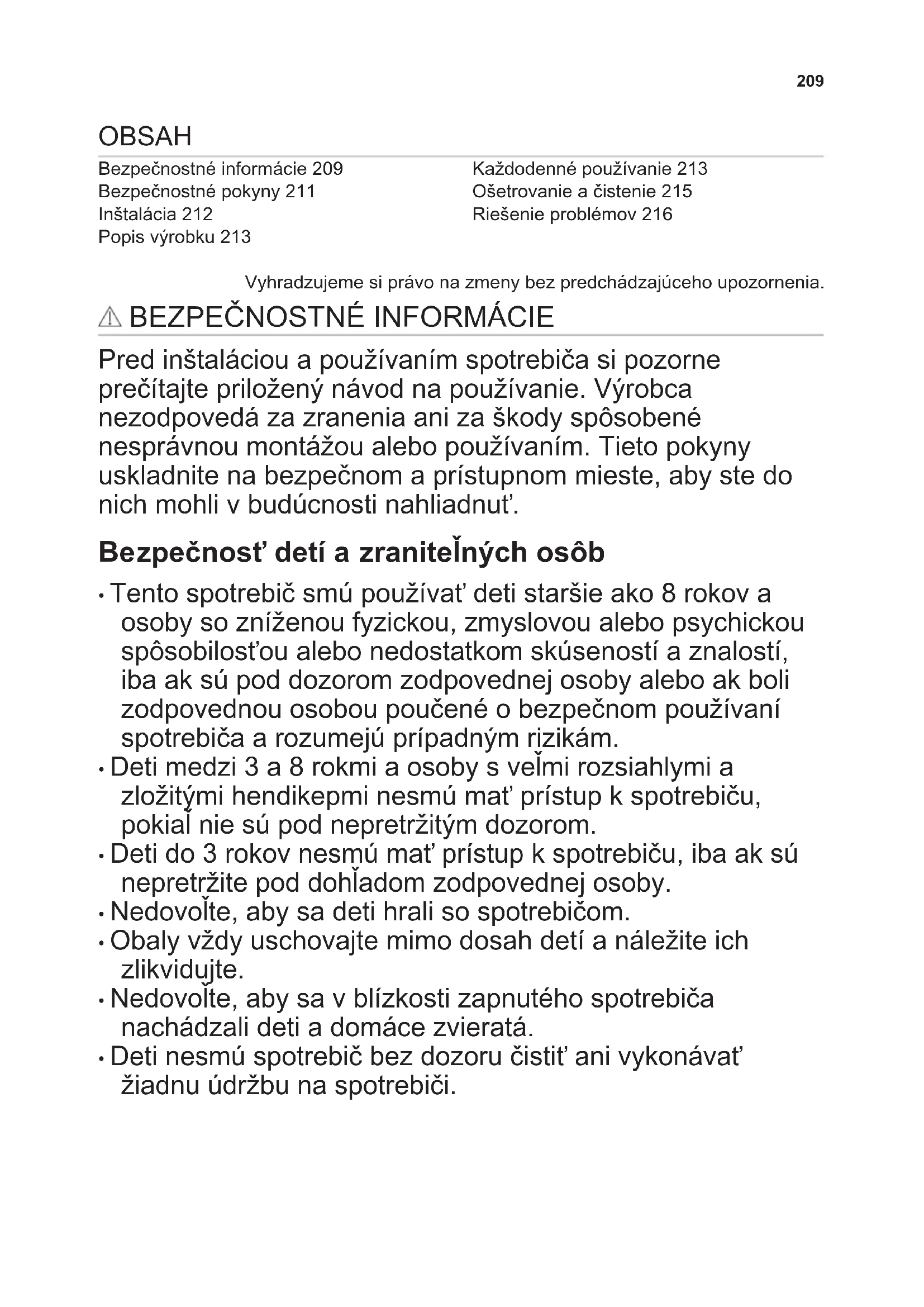 - Deti nesmú spotrebič bez dozoru čistiť ani vykonávať žiadnu údržbu na spotrebiči. 209Všeobecná bezpečnosť