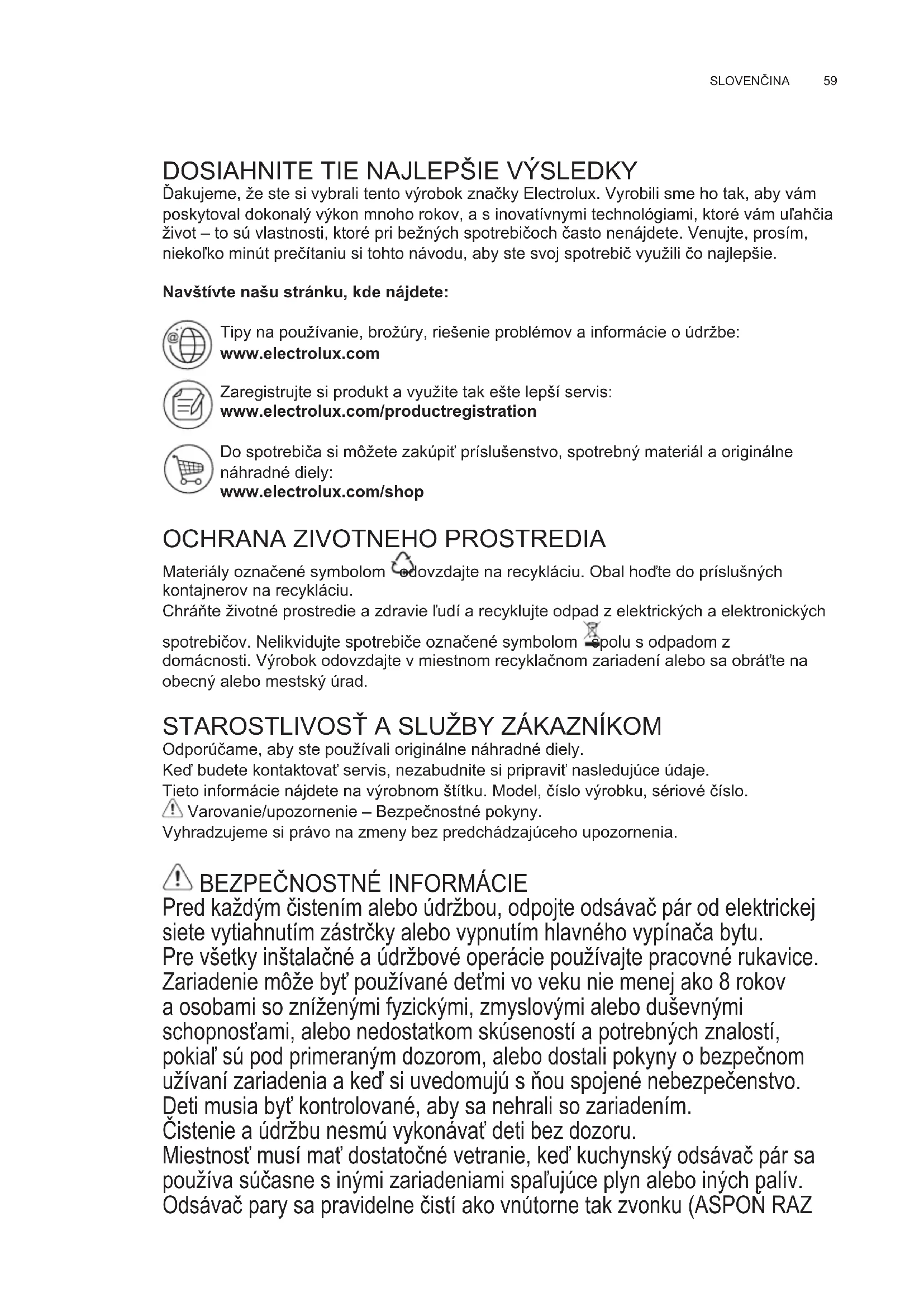 Pred každým čistením alebo údržbou, odpojte odsávač pár od elektrickej siete vytiahnutím zástrčky alebo vypnutím hlavného vypínača bytu. Pre všetky inštalačné a údržbové operácie používajte pracovné rukavice. Zariadenie môže byť používané deťmi vo veku nie menej ako 8 rokov a osobami so zníženými fyzickými, zmyslovými alebo duševnými schopnosťami, alebo nedostatkom skúseností a potrebných znalostí, pokiaľ sú pod primeraným dozorom, alebo dostali pokyny o bezpečnom užívaní zariadenia a keď si uvedomujú s ňou spojené nebezpečenstvo. Deti musia byť kontrolované, aby sa nehrali so zariadením. Čistenie a údržbu nesmú vykonávať deti bez dozoru. Miestnosť musí mať dostatočné vetranie, keď kuchynský odsávač pár sa používa súčasne s inými zariadeniami spaľujúce plyn alebo iných palív. Odsávač pary sa pravidelne čistí ako vnútorne tak zvonku (ASPOŇ RAZ SK NÁVOD NA POUŽÍVANIEwww.electrolux.com