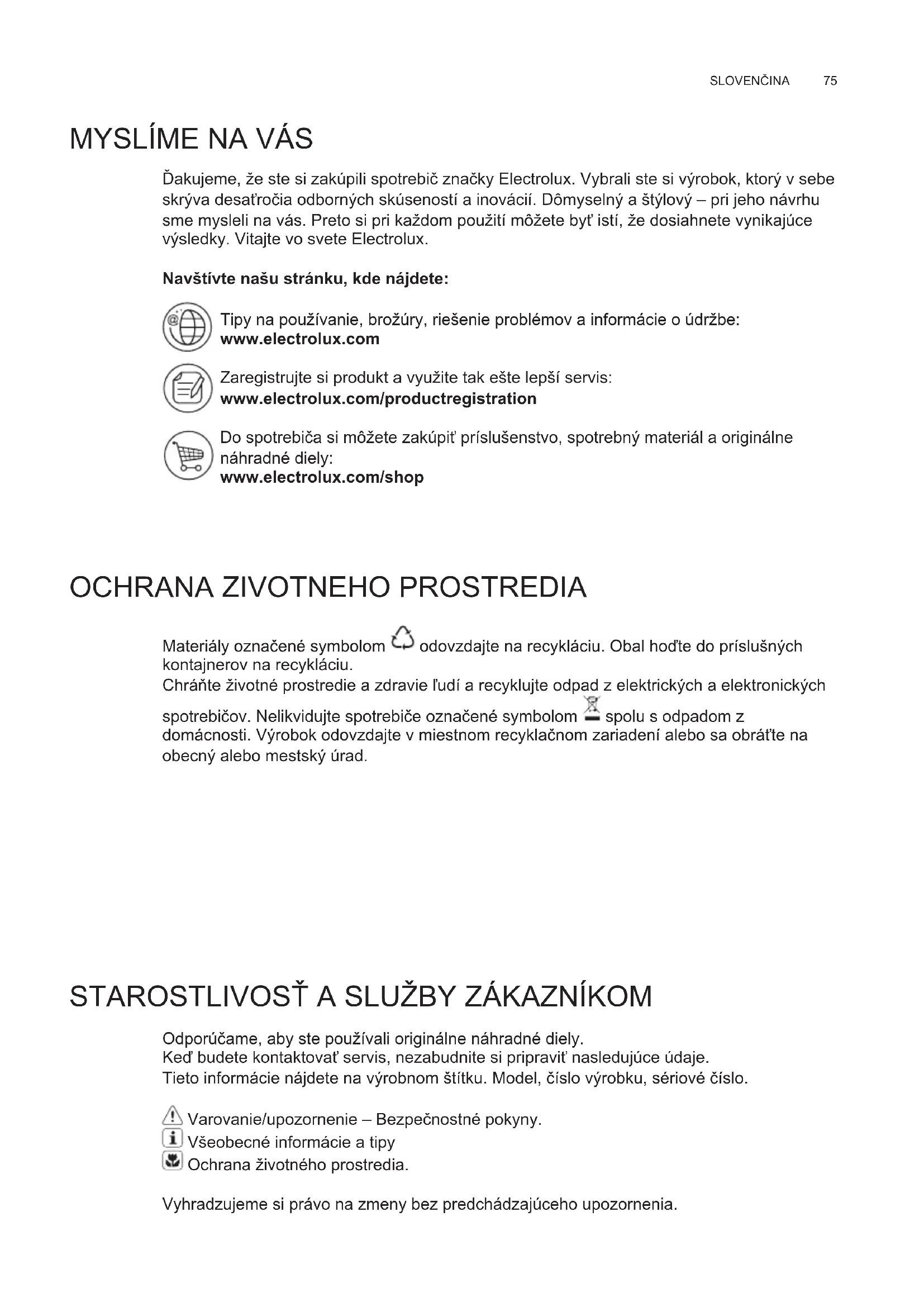 Ďakujeme, že ste si zakúpili spotrebič značky Electrolux. Vybrali ste si výrobok, ktorý v sebe skrýva desaťročia odborných skúseností a inovácií. Dômyselný a štýlový – pri jeho návrhu sme mysleli na vás. Preto si pri každom použití môžete byť istí, že dosiahnete vynikajúce výsledky. Vitajte vo svete Electrolux. Navštívte našu stránku, kde nájdete: Tipy na používanie, brožúry, riešenie problémov a informácie o údržbe: www.electrolux.com Zaregistrujte si produkt a využite tak ešte lepší servis: www.electrolux.com/productregistration Do spotrebiča si môžete zakúpiť príslušenstvo, spotrebný materiál a originálne náhradné diely: www.electrolux.com/shop