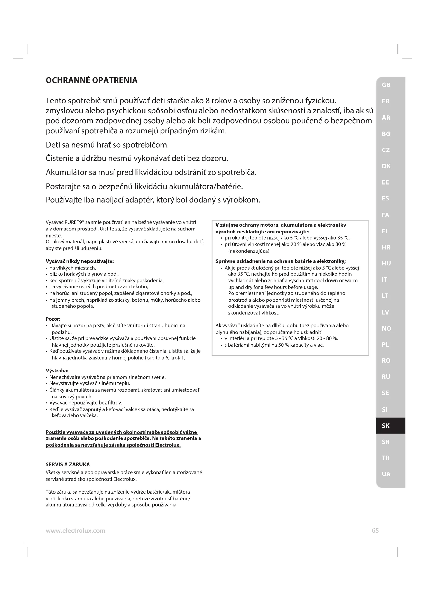 Všetky servisné alebo opravárske práce smie vykonať len autorizované servisné stredisko spoločnosti Electrolux. Táto záruka sa nevzťahuje na zníženie výdrže batérie/akumlátora v dôsledku starnutia alebo používania, pretože životnosť batérie/ akumulátora závisí od celkovej doby a spôsobu používania. OCHRANNÉ OPATRENIA Tento spotrebič smú používať deti staršie ako 8 rokov a osoby so zníženou fyzickou, zmyslovou alebo psychickou spôsobilosťou alebo nedostatkom skúseností a znalostí, iba ak sú pod dozorom zodpovednej osoby alebo ak boli zodpovednou osobou poučené o bezpečnom používaní spotrebiča a rozumejú prípadným rizikám. Deti sa nesmú hrať so spotrebičom. Čistenie a údržbu nesmú vykonávať deti bez dozoru. Akumulátor sa musí pred likvidáciou odstrániť zo spotrebiča. Postarajte sa o bezpečnú likvidáciu akumulátora/batérie. Používajte iba nabíjací adaptér, ktorý bol dodaný s výrobkom. V záujme ochrany motora, akumulátora a elektroniky výrobok neskladujte ani nepoužívajte: