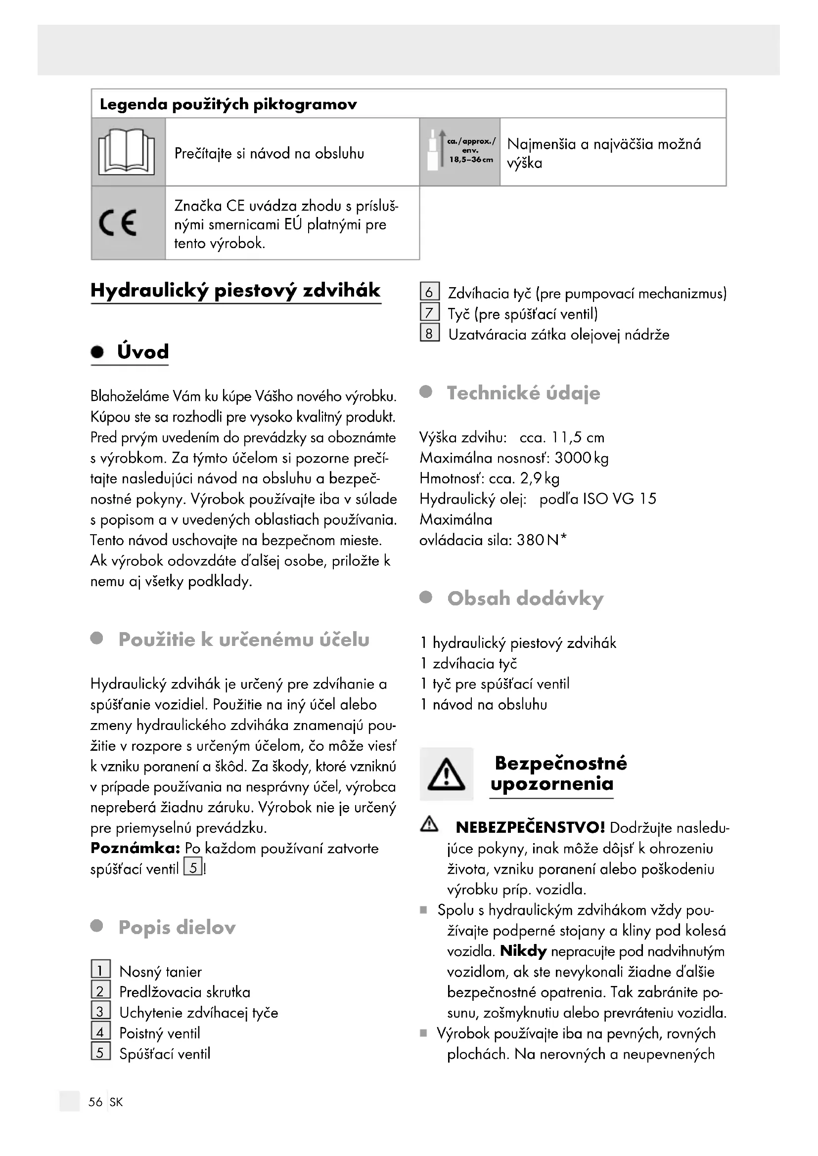 Obsah dodávky 1 hydraulický piestový zdvihák 1 zdvíhacia tyč 1 tyč pre spúšťací ventil 1 návod na obsluhu Bezpečnostné upozornenia NEBEZPEČENSTVO! Dodržujte nasledu- júce pokyny, inak môže dôjsť k ohrozeniu života, vzniku poranení alebo poškodeniu výrobku príp. vozidla. Spolu s hydraulickým zdvihákom vždy pou- žívajte podperné stojany a kliny pod kolesá vozidla. Nikdy nepracujte pod nadvihnutým vozidlom, ak ste nevykonali žiadne ďalšie bezpečnostné opatrenia. Tak zabránite po- sunu, zošmyknutiu alebo prevráteniu vozidla. Výrobok používajte iba na pevných, rovných plochách. Na nerovných a neupevnených57 SK plochách – ako napríklad štrkový povrch – môže dôjsť k zošmyknutiu bremena. Dbajte na to, aby ste nikdy neprekročili povolené menovité zaťaženie (nosnosť). Je potrebné, aby osoba, ktorá obsluhuje prístroj, mohla počas všetkých pohybov sledovať zdvíhací prístroj a bremeno. Nie je dovolené pracovať pod nadvihnu- tým bremenom, ak toto bremeno nie je istené vhodnými prostriedkami. Hydraulický zdvihák nesmú používať nekvalifikované a neskúsené osoby. Pred používaním hydraulického zdviháka zaistite vozidlo proti pohybu. Zatiahnite ručnú brzdu, zaraďte rýchlosť (v prípade automatickej prevodovky „P“) a zaistite vozidlo klinmi pod kolesami. Napriek bezpečnostným opatreniam buďte vždy opatrní a počas celej doby práce na vozidle kontrolujte, či záťažový tanier