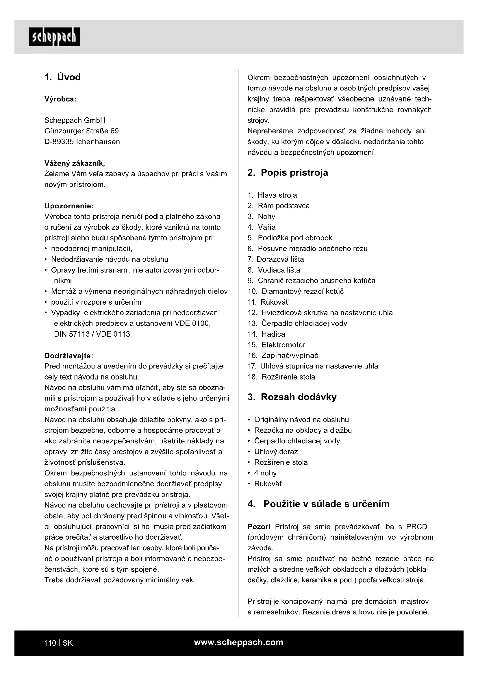 Výrobca: Scheppach GmbH Günzburger Straße 69 D-89335 Ichenhausen Vážený zákazník, Želáme Vám veľa zábavy a úspechov pri práci s Vaším novým prístrojom. Upozornenie: Výrobca tohto prístroja neručí podľa platného zákona o ručení za výrobok za škody, ktoré vzniknú na tomto prístroji alebo budú spôsobené týmto prístrojom pri: