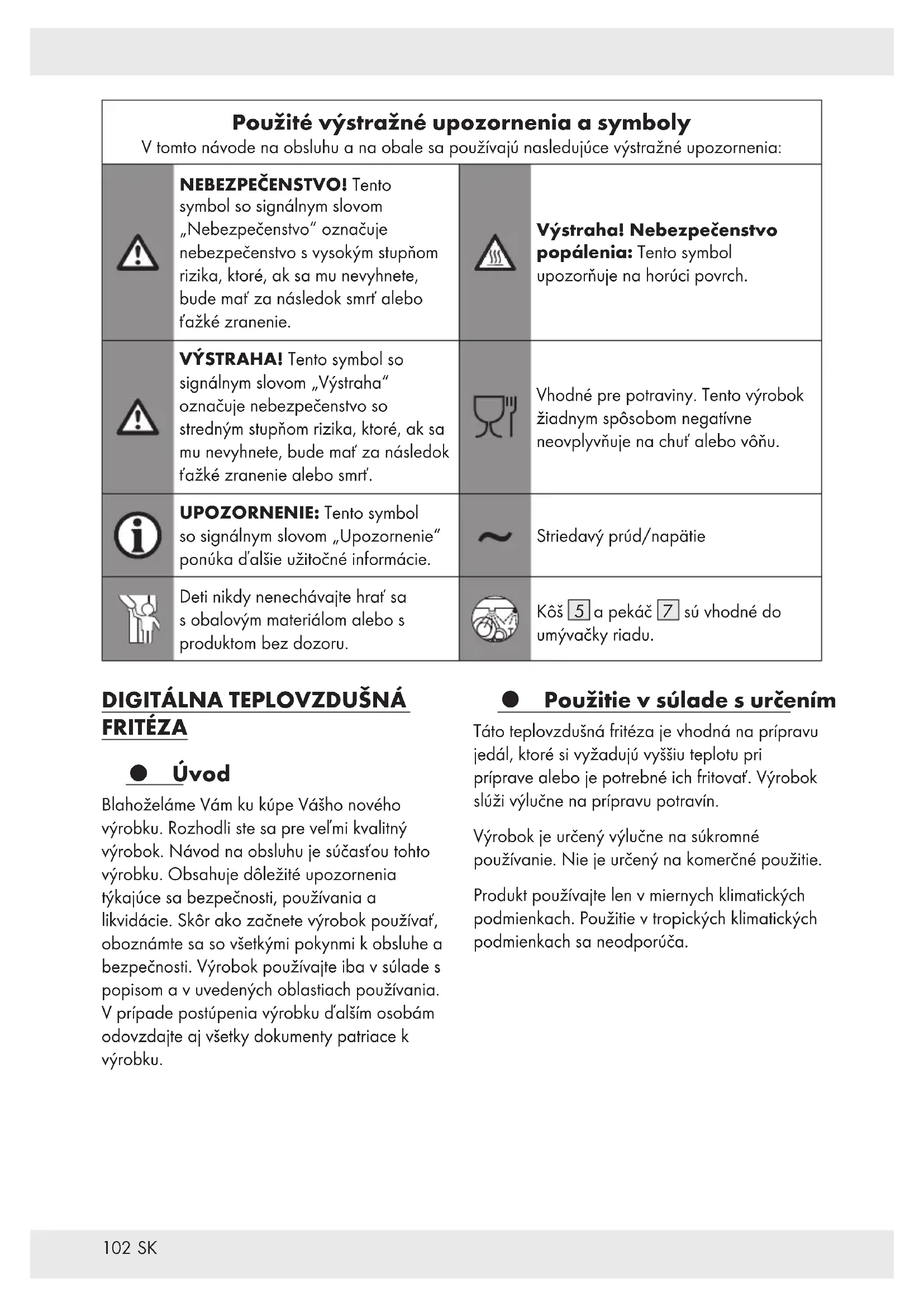 Použité výstražné upozornenia a symboly V tomto návode na obsluhu a na obale sa používajú nasledujúce výstražné upozornenia: NEBEZPEČENSTVO! Tento symbol so signálnym slovom „Nebezpečenstvo“ označuje nebezpečenstvo s vysokým stupňom rizika, ktoré, ak sa mu nevyhnete, bude mať za následok smrť alebo ťažké zranenie. Výstraha! Nebezpečenstvo popálenia: Tento symbol upozorňuje na horúci povrch. VÝSTRAHA! Tento symbol so signálnym slovom „Výstraha“ označuje nebezpečenstvo so stredným stupňom rizika, ktoré, ak sa mu nevyhnete, bude mať za následok ťažké zranenie alebo smrť. Vhodné pre potraviny. Tento výrobok žiadnym spôsobom negatívne neovplyvňuje na chuť alebo vôňu. UPOZORNENIE: Tento symbol so signálnym slovom „Upozornenie“ ponúka ďalšie užitočné informácie. Striedavý prúd/napätie Deti nikdy nenechávajte hrať sa s obalovým materiálom alebo s produktom bez dozoru. Kôš