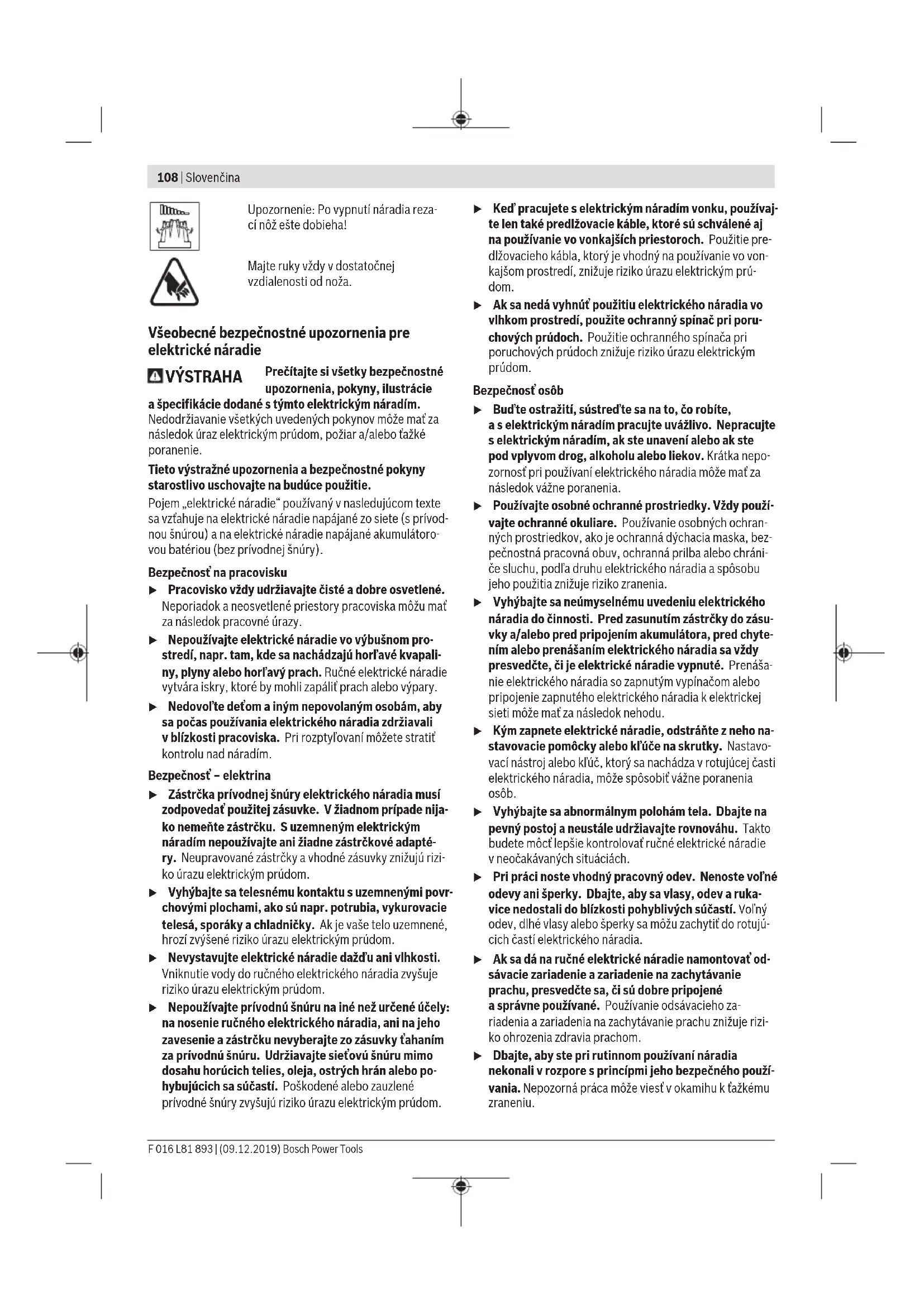 Stiskněte odjišťovací tlačítko (12) a posuňte kryt (5) dozadu. Sejměte kryt (5) z tělesa. Překlopte střižný nůž (6)/(7) nahoru a poté střižný nůž (6)/ (7) vyjměte. Vyrovnejte vybrání na střižném noži (6)/(7) na přidržovací kolíky a následně překlopte střižný nůž (6)/(7) dolů. Opět nasaďte kryt (5) a poté jej posuňte vpřed až zaskočí. Provoz u Dbejte na to, aby kryt USB zdířky (2) byl během provozu uzavřený. Tak zabráníte vniknutí prachu. u Nepoužívejte žádné poškozené nože (např. žádné trhliny apod.). Poškozené nože ihned vyměňte. Zapnutí - vypnutí (viz obrázek D) Stiskněte blokování zapnutí (4) a ve stisknutém stavu stlačte spínač (3). Blokování zapnutí (4) uvolněte. Když stlačíte spínač (3), svítí LED trvale zeleně. Ukazatel stavu nabití akumulátoru LED Kapacita LED svítí trvale zeleně 33−100% LED svítí trvale červeně, zatímco spínač je zpola stlačený 0-33% Stříhání živých plotů (pouze nůžky na keře) u Dbejte, aby byl výrobek při odstraňování odstřiženého materiálu nebo při údržbě vypnutý. Neúmyslné zapnutí může vést k těžkým poraněním. Před začátkem práce zkontrolujte živý plot na skrytá cizí tělesa jako např. zahradní ploty. Lze stříhat větvičky až do tloušťky max. 8 mm. Aby se dostaly větve k noži, pohybujte výrobkem na čáře střihu rovnoměrně vpřed. Oboustranná střihací lišta umožňuje střih v obou směrech nebo kyvadlovým pohybem z jedné strany na druhou. Po použití nasaďte na nože ochranu střižného nože. Doporučené roční doby Listnaté živé ploty stříhejte v červnu a v říjnu. Jehličnaté živé ploty stříhejte v dubnu a v srpnu. Konifery a další rychle rostoucí živé ploty stříhejte od května ca. každých 6týdnů. Stříhání okrajů (pouze nůžky na trávu) Výrobek veďte podél okraje trávníku. Zabraňte tomu, aby se nůž dostal do kontaktu sdlažbou, kameny nebo zídkami, protože by se tím výrazně zkrátila životnost nože. Po použití nasaďte na nože ochranu střižného nože. Hledání závad Příznaky Možná příčina Odstranění Krátká doba stříhání na nabití akumulátoru Akumulátor se blíží konci své životnosti Vyhledejte servis. Ukazatel nabití akumulátoru svítí Příliš vysoká teplota akumulátoru Teplota okolí je příliš vysoká. Zahradní nářadí nevystavujte přímému slunci. Počkejte 10–15 minut, aby akumulátor mohl vychladnout. F 016 L81 893 | (09.12.2019) Bosch Power ToolsSlovenčina | 107 Příznaky Možná příčina Odstranění červeně a zahradní nářadí nelze zapnout. Údržba a servis Údržba, čištění a skladování u Udržujte elektronářadí avětrací otvory čisté, aby pracovalo dobře abezpečně. u Udržujte výrobek čistý, abyste mohli dobře a bezpečně pracovat. Neodkládejte na zahradní nářadí jiné předměty. Udržujte výrobek a větrací otvory čisté, abyste mohli dobře a bezpečně pracovat. Nikdy nekropte výrobek vodou. Nikdy neponořujte výrobek pod vodu. Skladujte výrobek na bezpečném místě, v suchu a mimo dosah dětí. Neodkládejte na výrobek žádné další předměty. Zajistěte pevné usazení všech matic, čepů a šroubů, tím je umožněna bezpečná práce s výrobkem. Výrobek kontrolujte a opotřebované nebo poškozené díly pro jistotu nahraďte. Zajistěte, aby vyměněné díly pocházely od firmy Bosch. Zákaznická služba aporadenství ohledně použití www.bosch-garden.com U všech dotazů aobjednávek náhradních dílů nezbytně prosím uvádějte 10-místné objednací číslo podle typového štítku výrobku. Czech Republic Robert Bosch odbytová s.r.o. Bosch Service Center PT K Vápence 1621/16 692 01 Mikulov Na www.bosch-pt.cz si si můžete objednat opravu Vašeho stroje nebo náhradní díly online. Tel.: +420 519 305700 Fax: +420 519 305705 E-Mail: servis.naradi@cz.bosch.com www.bosch-pt.cz Přeprava Obsažené lithium-iontové akumulátory podléhají požadavkům zákona onebezpečných nákladech. Tyto akumulátory mohou být bez dalších podmínek přepravovány uživatelem po silnici. Při zasílání prostřednictvím třetí osoby (např.: letecká přeprava nebo spedice) je třeba brát zřetel na zvláštní požadavky na balení aoznačení. Zde musí být při přípravě zásilky nezbytně přizván expert na nebezpečné náklady. Likvidace Výrobky, akumulátory, příslušenství a obaly mají být dodány k opětovnému zhodnocení nepoškozujícímu životní prostředí. Výrobky aakumulátory/baterie nevyhazujte do domovního odpadu! Pouze pro zeměEU: Podle evropské směrnice 2012/19/EU musejí být neupotřebitelné výrobky a podle evropské směrnice 2006/66/ES vadné nebo opotřebované akumulátory/ baterie odděleně shromážděny a dodány k opětovnému zhodnocení nepoškozujícímu životní prostředí. Akumulátory/baterie: Lithium-iontové: Dodržujte pokyny uvedené včásti Přeprava (viz „Přeprava“, Stránka107). u Integrované akumulátory smí kvůli likvidaci odejmout pouze odborný personál. Otevřením skořepiny tělesa se může výrobek zničit. Pro vyjmutí akumulátoru zvýrobku nechte výrobek tak dlouho v činnosti, dokud nebude akumulátor úplně vybitý. Pro vyjmutí akumulátoru vyšroubujte šrouby natělese askořepinu tělesa odejměte. Abyste zabránili zkratu, postupně odpojte jednotlivé přípoje na akumulátoru apóly pak zaizolujte. Ipo úplném vybití může mít akumulátor ještě zbytkovou kapacitu, která se může vpřípadě zkratu uvolnit. Slovenčina Bezpečnostné pokyny Vysvetlenie symbolov Prečítajte si tento Návod na používa- nie. Dávajte pozor na to, aby sa osoby stojace vblízkosti neporanili odletujú- cimi cudzími telieskami. Upozornenie: Keď sa výrobok pracu- je, zachovávajte si od neho bezpečný odstup. Nepoužívajte t
