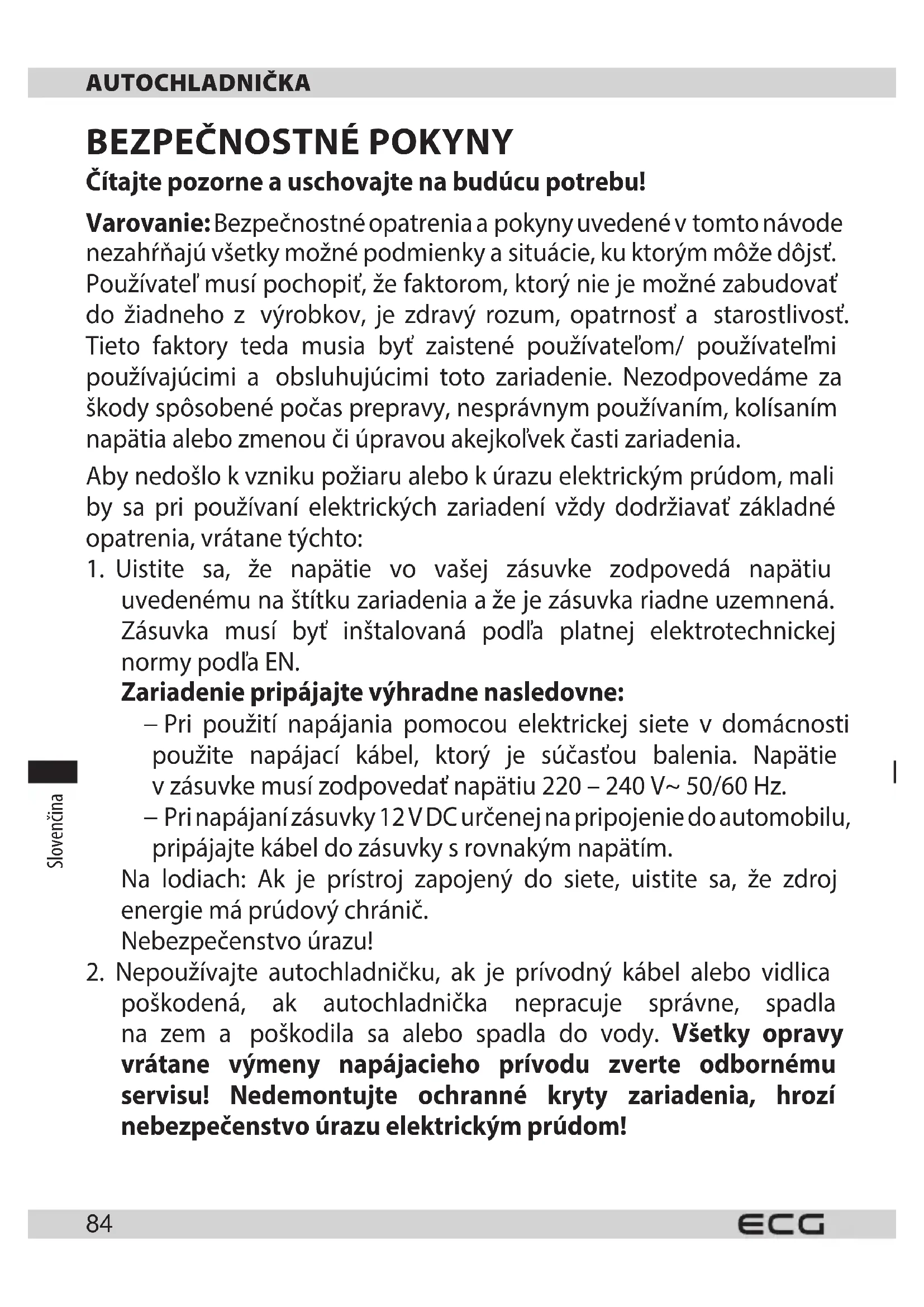 Baliaci papier avlnitá lepenka – odovzdajte do zberných surovín. Prebalová fólia, PE vrecká, plastové diely – vyhadzujte do kontajnerov na plasty. LIKVIDÁCIA VÝROBKU PO SKONČENÍ ŽIVOTNOSTI Likvidácia použitých elektrických aelektronických zariadení (platí včlenských krajinách EÚ aďalších európskych krajinách so zavedeným systémom triedenia odpadu)Vyobrazený symbol na produkte alebo na obale znamená, že sproduktom by sa nemalo nakladať ako sdomovým odpadom. Produkt odovzdajte na miesto určené na recykláciu elektrických aelektronických zariadení. Správnou likvidáciou produktu zabránite negatívnym vplyvom na ľudské zdravie a životné prostredie. Recyklácia materiálov prispieva kochrane prírodných zdrojov. Viac informácií orecyklácii tohto produktu vám poskytne obecný úrad, organizácia na spracovanie domového odpadu alebo predajné miesto, kde ste produkt kúpili. Tento výrobok spĺňa požiadavky smerníc EÚ o elektromagnetickej kompatibilite a elektrickej bezpečnosti. Návod na obsluhu je k dispozícii na webových stránkach www.ecg-electro.eu. Zmena textu a technických parametrov vyhradená.