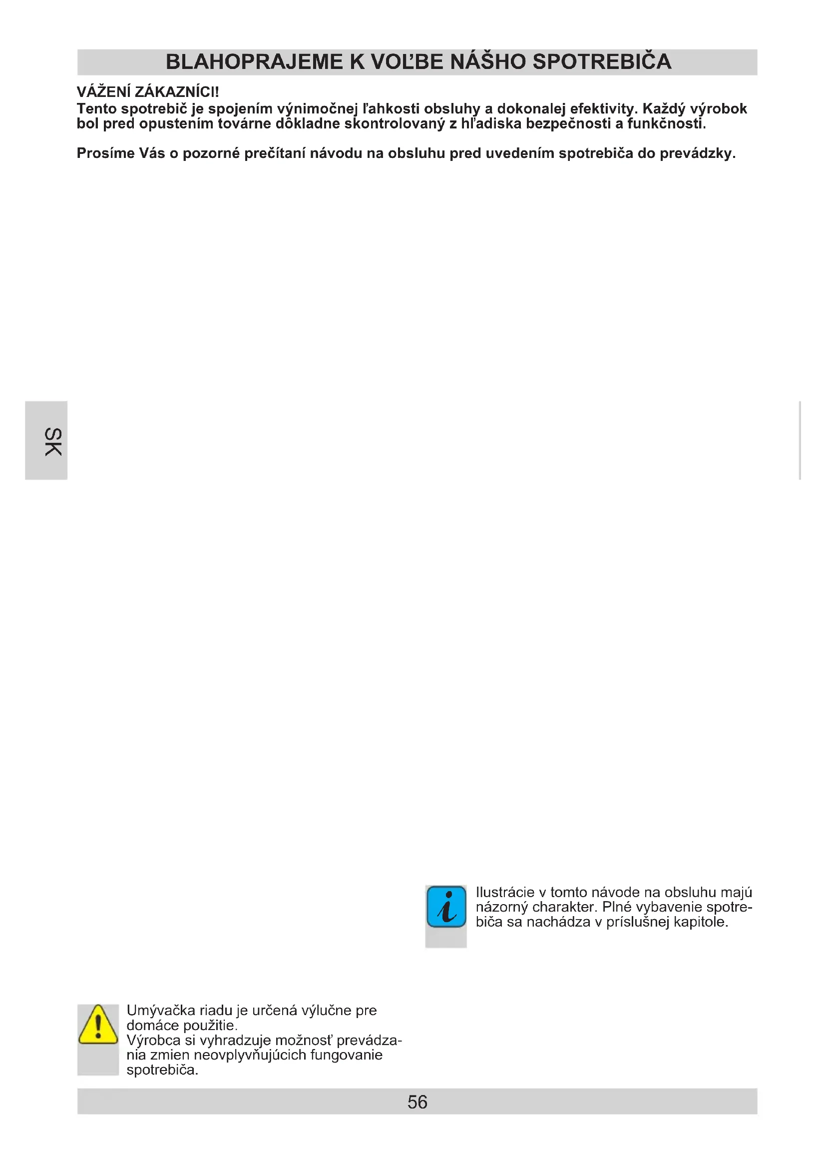 Umývačka riadu je určená výlučne pre domáce použitie. Výrobca si vyhradzuje možnosť prevádza- nia zmien neovplyvňujúcich fungovanie spotrebiča. SK57
