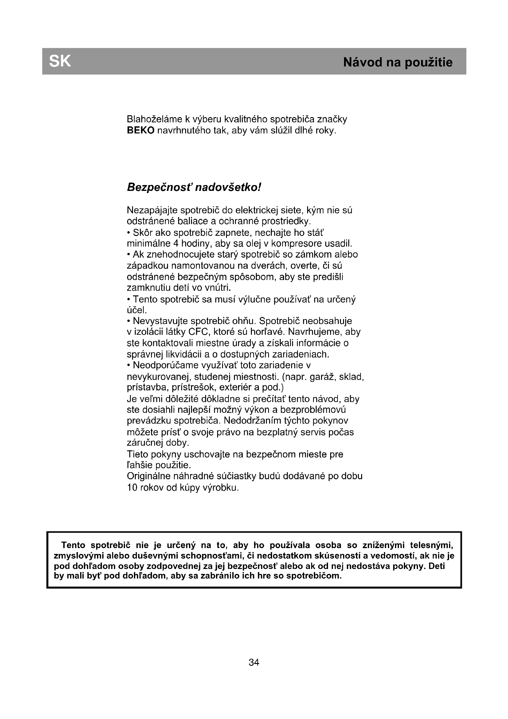 Tento spotrebič nie je určený na to, aby ho používala osoba so zníženými telesnými, zmyslovými alebo duševnými schopnosťami, či nedostatkom skúseností a vedomostí, ak nie je pod dohľadom osoby zodpovednej za jej bezpečnosť alebo ak od nej nedostáva pokyny. Deti by mali byť pod dohľadom, aby sa zabránilo ich hre so spotrebičom.35 Elektrické požiadavky Pred zasunutím zástrčky do zásuvky v stene sa uistite, že napätie a frekvencia uvedené na výkonovom štítku zodpovedajú zásobovaniu elektrickou energiou. Odporúčame, aby toto zariadenie bolo zapojené do elektrickej siete cez vhodnú zásuvku so spínačom na ľahko dostupnom mieste. Výstraha! Tento spotrebič musí byť uzemnený. Opravy tohto zariadenia by mal vykonávať kvalifikovaný technik. Nesprávne opravy vykonané nekvalifikovanou osobou spôsobujú nebezpečenstvo nepriaznivých následkov pre užívateľa spotrebiča. POZOR! Tento spotrebič pracuje s plynom R 600a, ktorý je ekologicky bezpečný, ale horľavý. Počas prepravy a zostavovania výrobku dbajte na to, aby ste nepoškodili chladiaci systém. Ak je poškodený chladiaci systém a unikol z neho plyn, udržte spotrebič mimo zdroja ohňa a na chvíľu vyvetrajte miestnosť. VÝSTRAHA – Nepoužívajte mechanické prístroje alebo iné prostriedky na urýchľovanie rozmrazovacieho procesu inak, ako odporúča výrobca. VÝSTRAHA – Nepoškoďte chladiaci okruh. VÝSTRAHA – Nepoužívajte elektrické zariadenia v priestoroch na potraviny, iba ak ide o typy odporúčané výrobcom. VÝSTRAHA – Ak je sieťový kábel poškodený, je potrebné, aby ho vymenil výrobca, servisný agent alebo podobne kvalifikovaná osoba, vyhnete sa tak možnému nebezpečenstvu. Prepravné pokyny