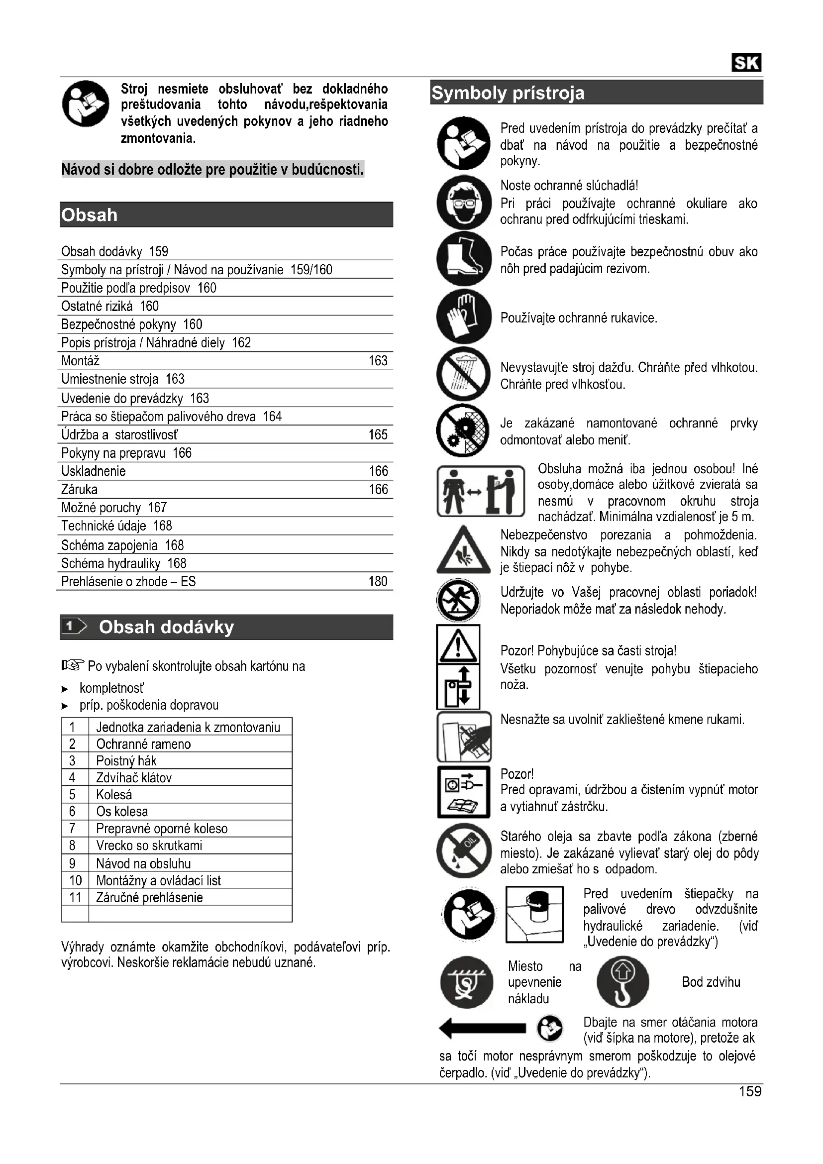 Obsah Obsah dodávky 159 Symboly na prístroji / Návod na používanie 159/160 Použitie podľa predpisov 160 Ostatné riziká 160 Bezpečnostné pokyny 160 Popis prístroja / Náhradné diely 162 Montáž 163 Umiestnenie stroja 163 Uvedenie do prevádzky 163 Práca so štiepačom palivového dreva 164 Údržba a starostlivosť 165 Pokyny na prepravu 166 Uskladnenie 166 Záruka 166 Možné poruchy 167 Technické údaje 168 Schéma zapojenia 168 Schéma hydrauliky 168 Prehlásenie o zhode – ES 180