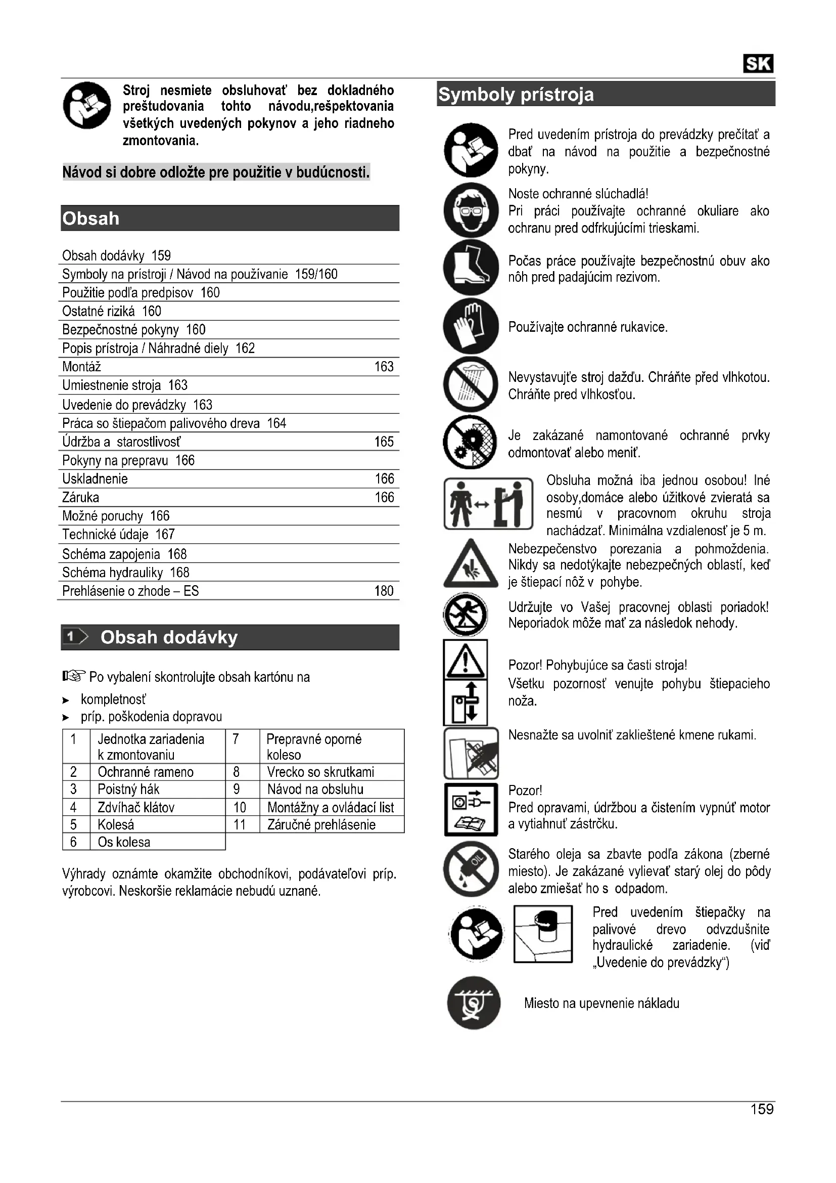 Obsah Obsah dodávky 159 Symboly na prístroji / Návod na používanie 159/160 Použitie podľa predpisov 160 Ostatné riziká 160 Bezpečnostné pokyny 160 Popis prístroja / Náhradné diely 162 Montáž 163 Umiestnenie stroja 163 Uvedenie do prevádzky 163 Práca so štiepačom palivového dreva 164 Údržba a starostlivosť 165 Pokyny na prepravu 166 Uskladnenie 166 Záruka 166 Možné poruchy 166 Technické údaje 167 Schéma zapojenia 168 Schéma hydrauliky 168 Prehlásenie o zhode – ES 180
