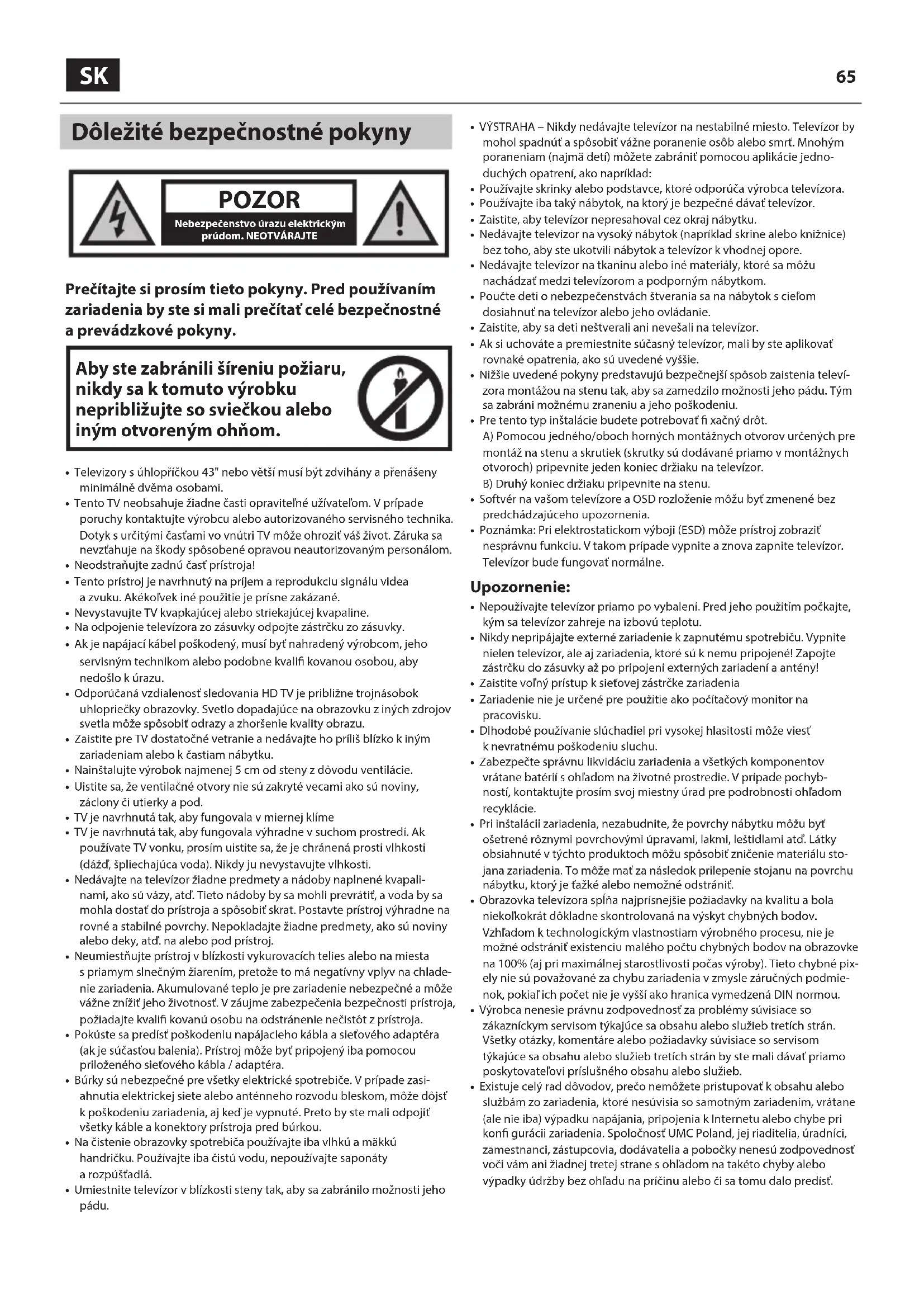 - Tento TV neobsahuje žiadne časti opraviteľné užívateľom. Vprípade poruchy kontaktujte výrobcu alebo autorizovaného servisného technika. Dotyk surčitými časťami vo vnútri TV môže ohroziť váš život. Záruka sa nevzťahuje na škody spôsobené opravou neautorizovaným personálom.