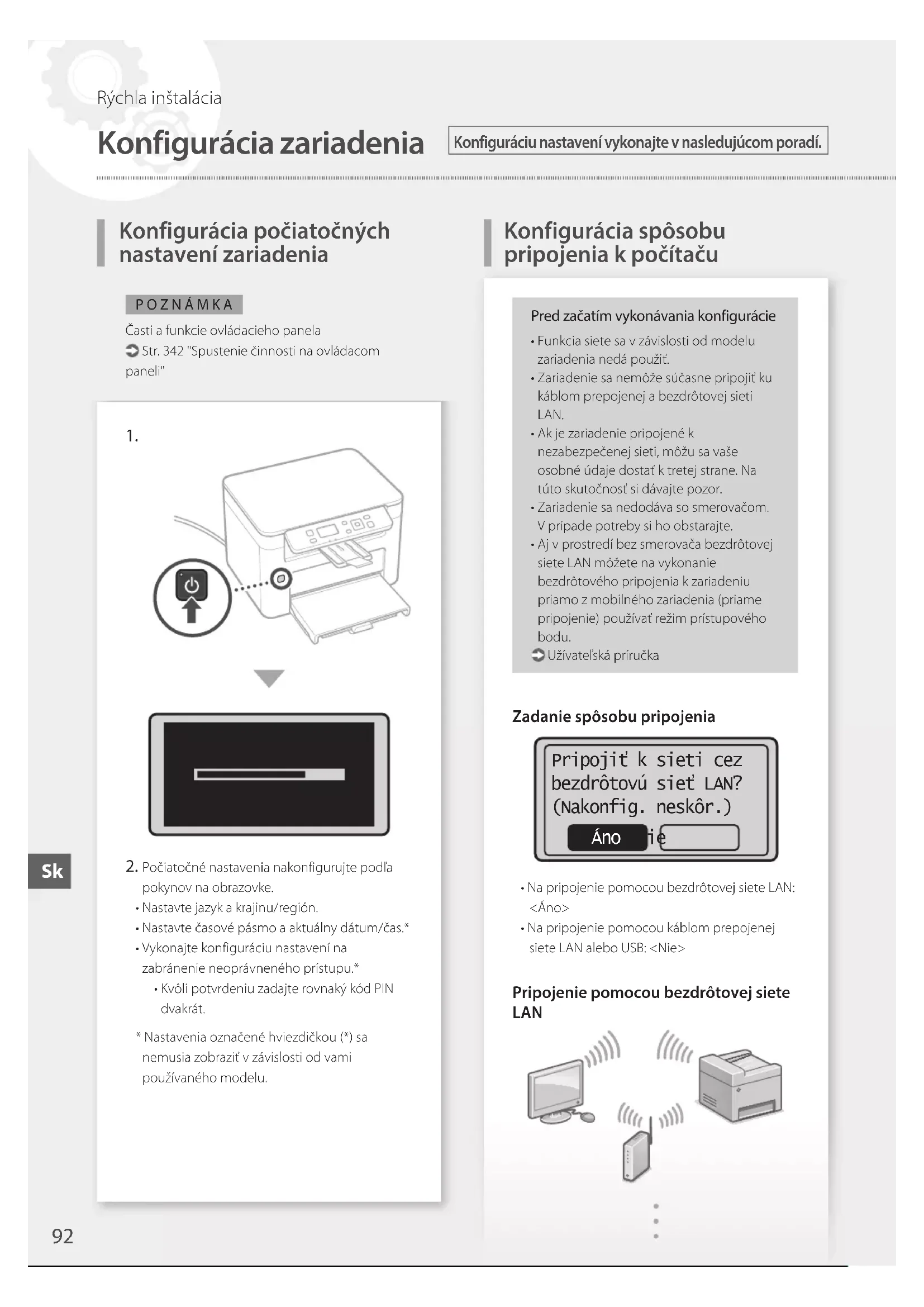 Počiatočné nastavenia nakonfigurujte podľa pokynov na obrazovke.• Nastavte jazyk a krajinu/región.• Nastavte časové pásmo a aktuálny dátum/čas.*• Vykonajte konfiguráciu nastavení na zabránenie neoprávneného prístupu.*• Kvôli potvrdeniu zadajte rovnaký kód PIN dvakrát.* Nastavenia označené hviezdičkou (*) sa nemusia zobraziť v závislosti od vami používaného modelu.Pred začatím vykonávania konfigurácie• Funkcia siete sa v závislosti od modelu zariadenia nedá použiť.• Zariadenie sa nemôže súčasne pripojiť ku káblom prepojenej a bezdrôtovej sieti LAN.